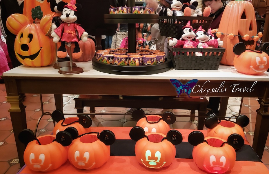 Shanghai Disney Resort’s Halloween merch was themed to vampire Mickey and witch Minnie. We suspected (and confirmed) that these were the same designs used both at Disneyland and Disney World this year. They also had the “Boo!” balloons that we saw at both domestic Disney Parks.Here are the light-up Mickey pumpkins that cast members were using for trick-or-treating. There were also mugs and t-shirts with the vampire Mickey/witch Minnie design.