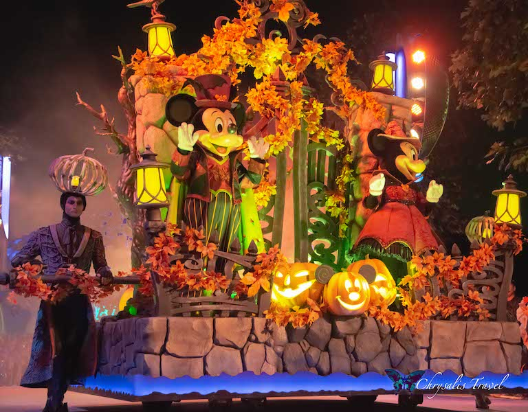 Shanghai Disneyland's evening parade, “Mickey’s Halloween Treat Cavalcade” was a hip mix of Disney Villains with Mickey and his pals. Tokyo DisneySea also included Mickey and friends in their “Villains World” water pageant this season. Hong Kong Disneyland’s “Villain’s Night Out! Chapter 3” included only Villains.Mickey and Minnie are on the first float. Goofy, Pluto, Donald and Daisy (dressed in their daytime meet and greet costumes) led the way. See their costumes up close in our accompanying article covering daytime Halloween festivities at Shanghai Disneyland.