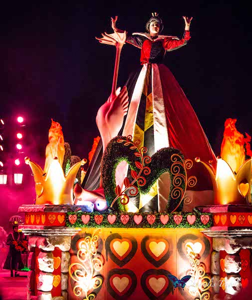 From the beginning, Shanghai Disneyland has favored the live-action interpretation of Alice in Wonderland. Their Alice maze features characters from Tim Burton’s world. This Queen of Hearts playing croquet in SHDL’s Halloween Cavalcade is not quite the animated version we usually see.