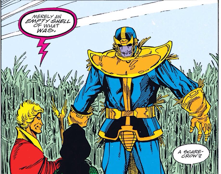 We then get a visual that might appear strange to those who are not familiar with the comics. Thanos has assembled a scarecrow of sorts out of his own armor. This shot is taken from the end of the Infinity Gauntlet comic arc. Still, we're not sure that the purpose of this scarecrow is. He just eliminated half of all life in the universe and he's still threatened by birds?