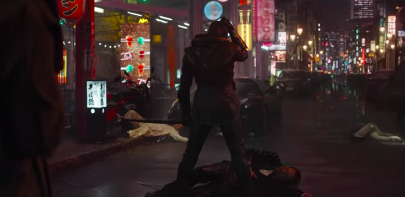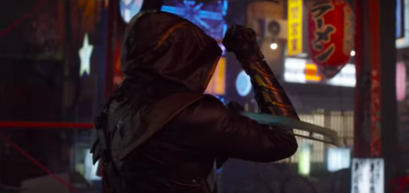 Immediately after Cap finishes the word "family," we get a look at a mysterious figure in a black costume. The ninja-like warrior cleans a sword with his arm.