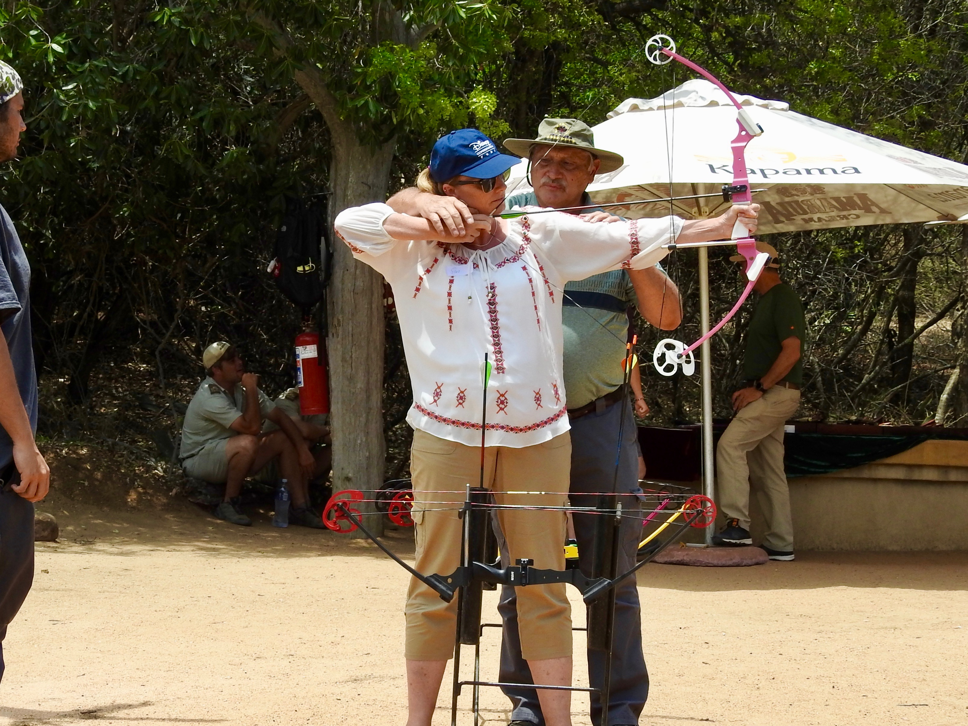 Today's goal was finding that last of the "big five" (rhino, elephant, leopard, African buffalo, and lion) and our morning drive we really went off road looking to no avail. But as you can see, we did see many amazing animals including a herd of elephants playing in a water hole. But as they moved, our ranger Rossie took off around the back because he saw a leopard, or as some of the other rangers teased him, a "warthog that just looked like a leopard." Once again, the last of our check off list alluded us.Archery and Beading with Lunch