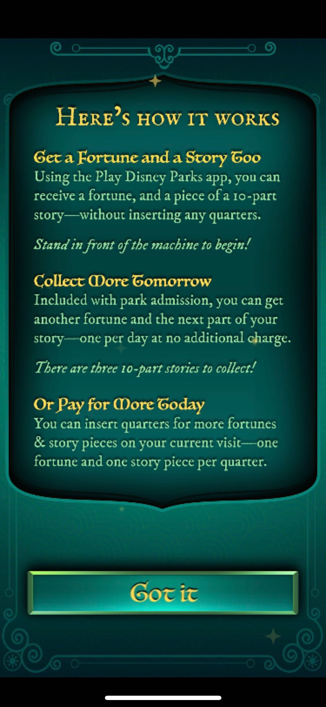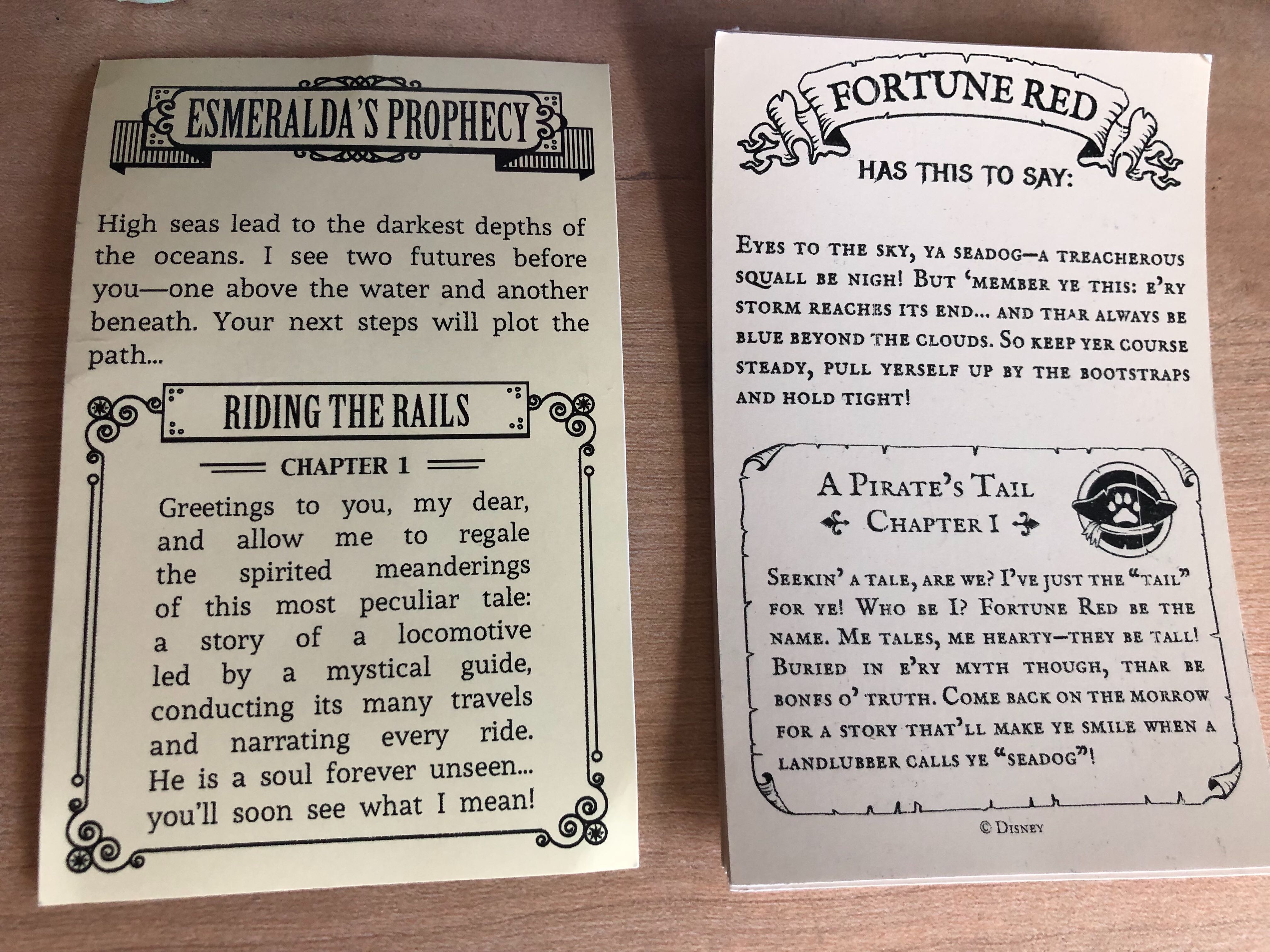 From this point on, you can acquire the parts of a story, one at a time, by following the instructions on-screen. According to Play Disney Parks, there are three ten-part stories to collect for each machine. The stories we started off with during our first encounter were "Riding the Rails" from Esmeralda (about "a locomotive led by a mystical guide") and "A Pirate's Tail" from Fortune Red (concerning a familiar-sounding encounter with a cursed key-bearing canine). I won't spoil the rest of these stories here, but guests can pick up another chapter from each machine once per day for no additional charge, or if you don't want to wait that long or don't happen to be a Disneyland regular, you can plunk down a quarter per chapter to complete the full tale during the same single-day visit."Fortune and Story" is another great way to get guests acquainted with the Play Disney Parks app before it becomes an integral part of Star Wars: Galaxy's Edge next year. And anyone who played the Haunted Mansion-themed Ghost Post immersive mailing experience knows this isn't the first time Esmeralda has responded to an official Disney app. Good fortune to you in retrieving these fun, strange stories from Disneyland!