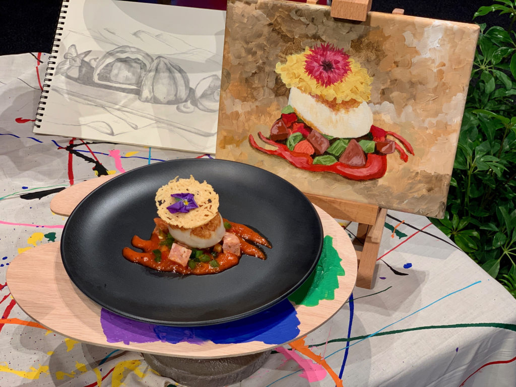 The Artist's Table - Pan-Seared Scallop with Chorizo, Roasted Red Pepper Coulis and a Parmesan Crisp (GF)