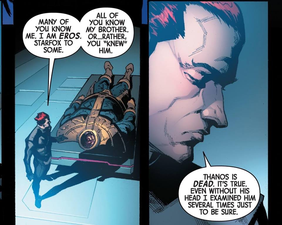 The story opens with a gathering of some of the most powerful beings in the universe, including Eros, the brother of Thanos, who we find out accounts for that disembodied text. We find out the reason they have all been called together is to eliminate the potential future threat that is Thanos’ mind being transferred into another body.