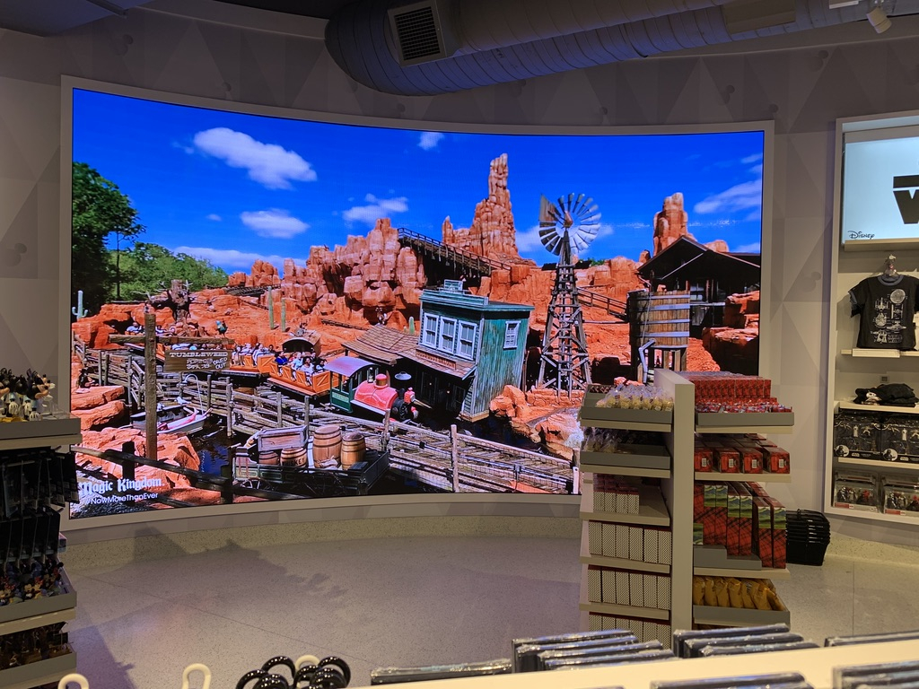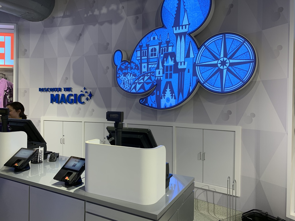 The checkout experience is also magical, with a unique touch behind the counter. Mickey’s side silhouette is filled with park icons, with one of his ears featuring a compass. That same compass can be found at both entry points to the shop, helping you navigate your way home and back again. Next to the register is a giant screen mural inside the store that offers similar glimpses into the World as the one outside the store.