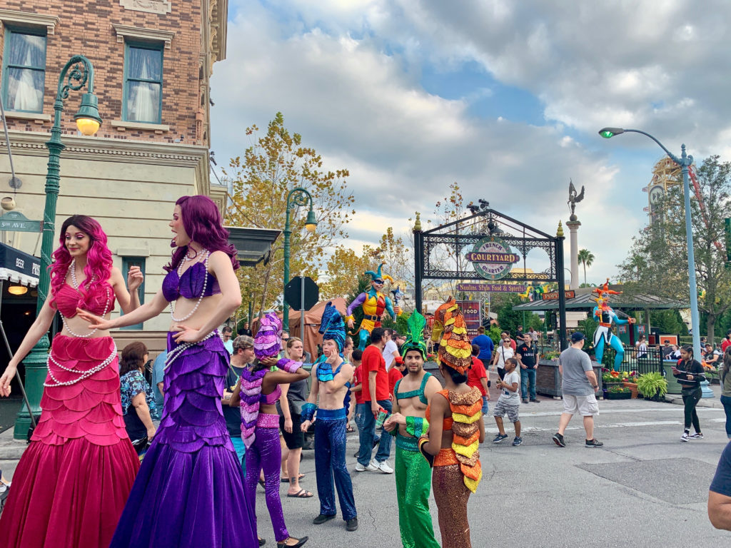 All day, as you stroll throughout the park, you will notice the normal background music themed to the different areas have been replaced by music to get you in the mood to celebrate Mardi Gras. But as the afternoon starts to turn to evening, the real party begins. From live bands to stilt walkers and other street performers, the park really comes alive around 4 pm — which also happens to be the same time The French Quarter Courtyard opens with some true “N’awlins Style Food and Spirits.”