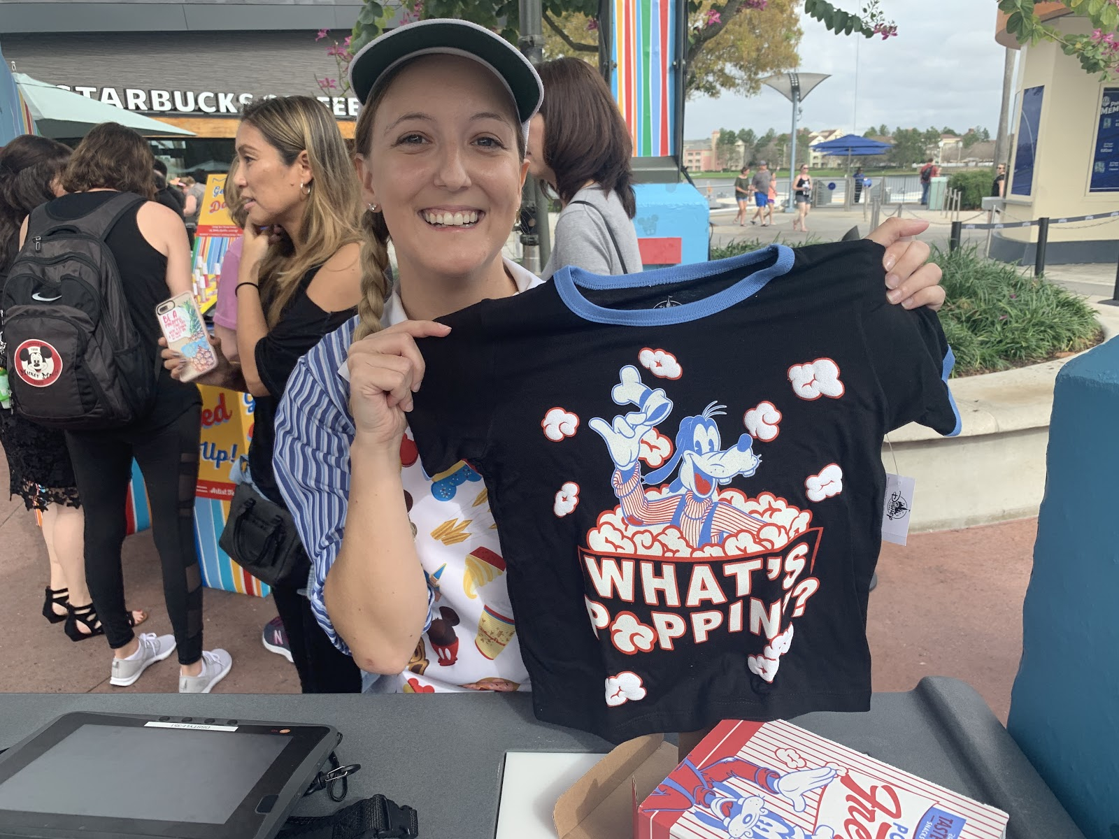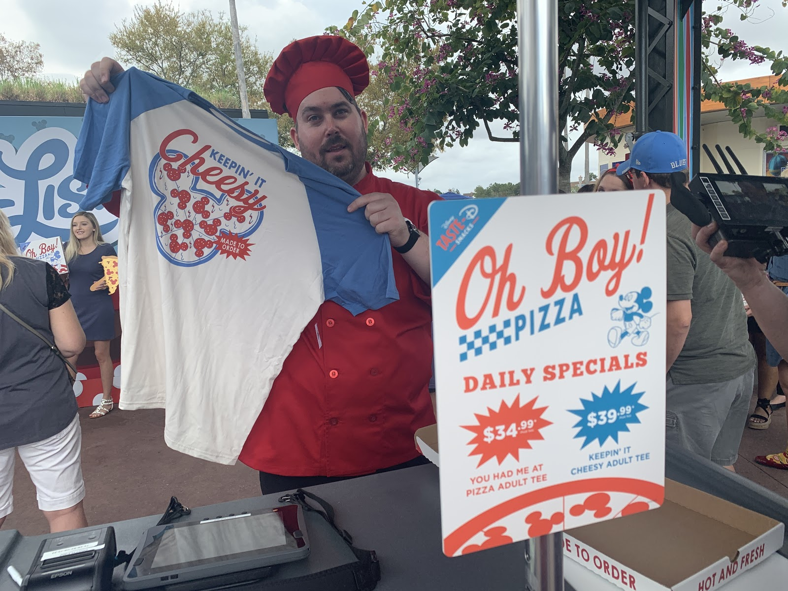 Merchandise is sold at “snack kiosks.” The special apparel is sold in themed boxes. For example the popcorn t-shirt comes in a popcorn box while the pizza shirt comes in a pizza box.