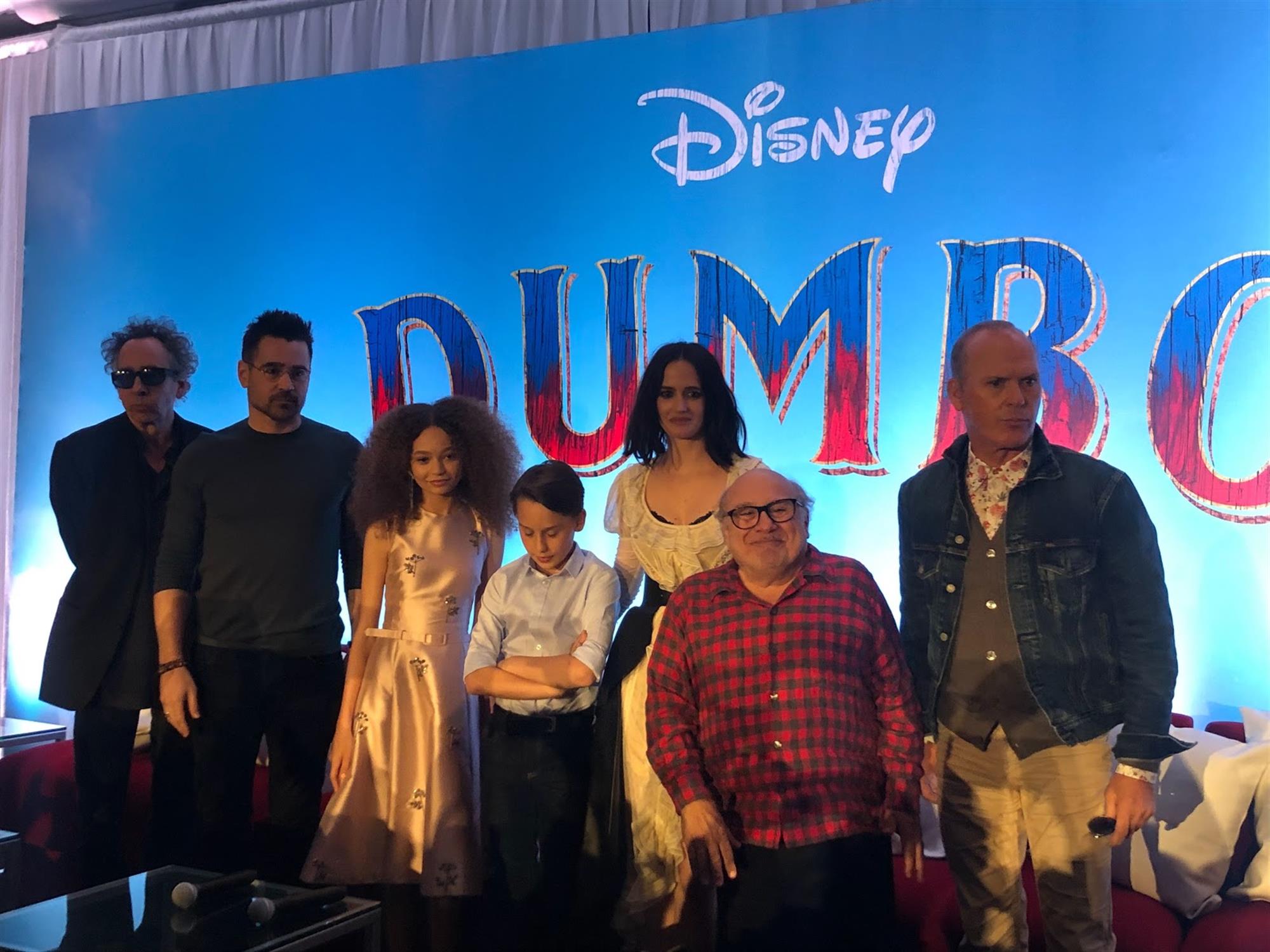 Taking the stage at the event were Dumbo’s legendary director Tim Burton (of Disney’s 2010 Alice in Wonderland revamp) alongside the film’s cast members Colin Farrell (who plays Holt Farrier), Nico Parker (Milly Farrier), Finley Hobbins (Joe Farrier), Eva Green (Colette Marchant), Danny DeVito (Max Medici), and Michael Keaton (V.A. Vandevere).