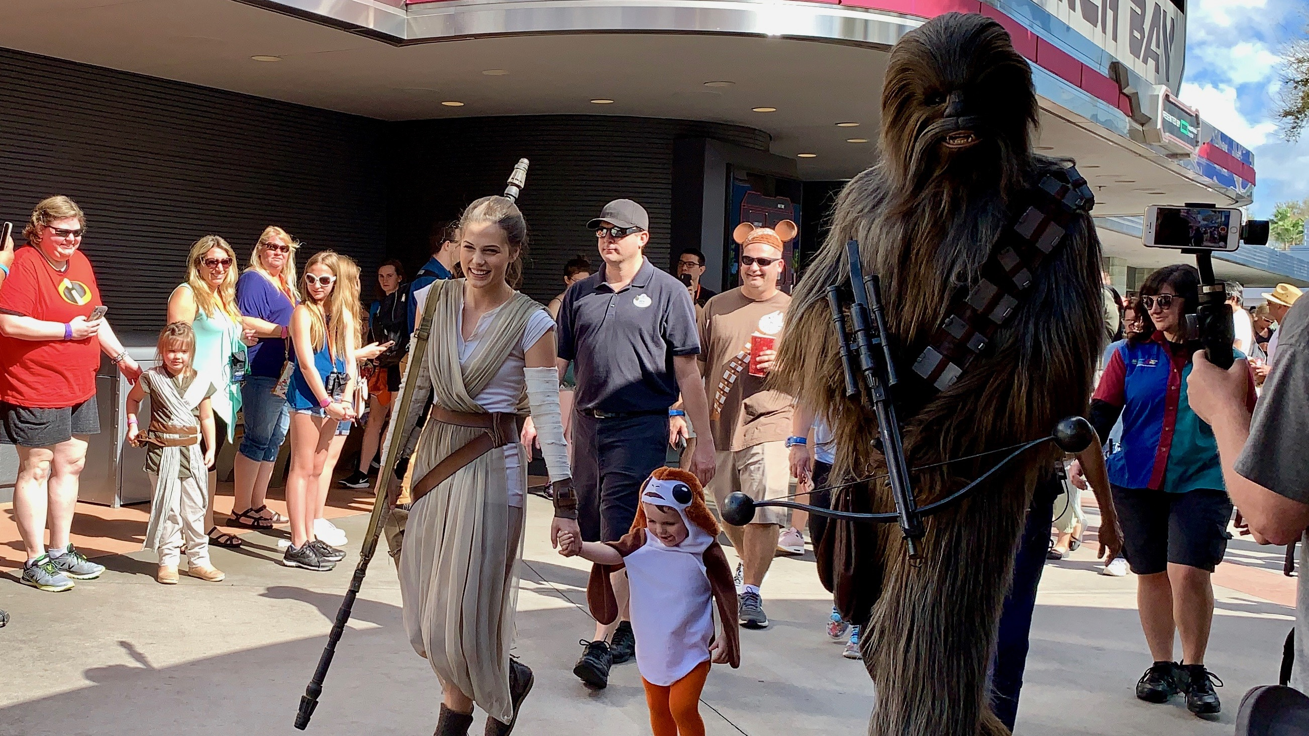 After some unclose encounters, we popped out of Star Wars Launch Bay just in time to catch the "parade" of characters returning from the Star Wars A Galaxy Far, Far Away stage show, including a cameo by a little porg Rey picked up on her way back.