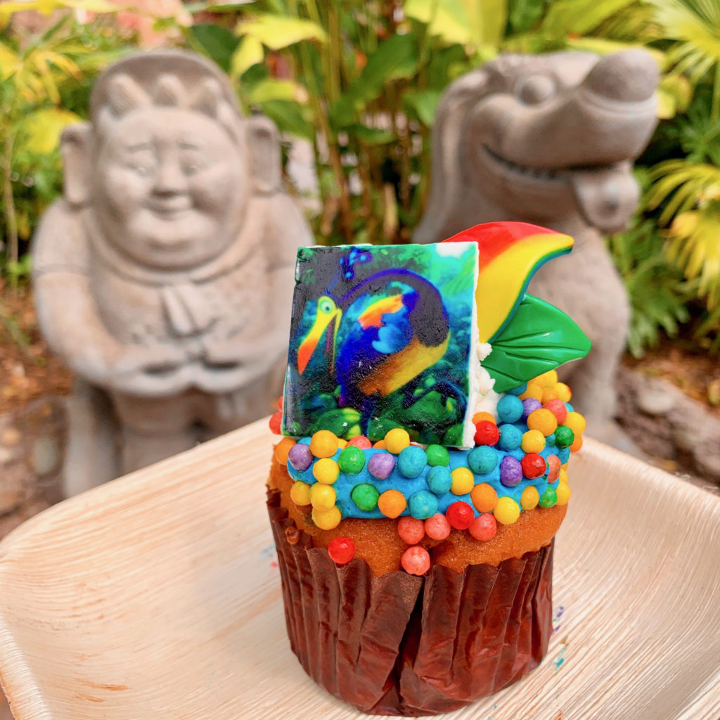 A new addition to the food offerings in Asia is the Kevin Cupcake! This yummy yellow cake with baked-in sprinkles is filled with strawberry mousse and is topped with a "sky” of buttercream, crispy white chocolate pearls reminiscent of the Up balloons, with fondant leaves, and an edible chocolate picture of Kevin to top it all off.