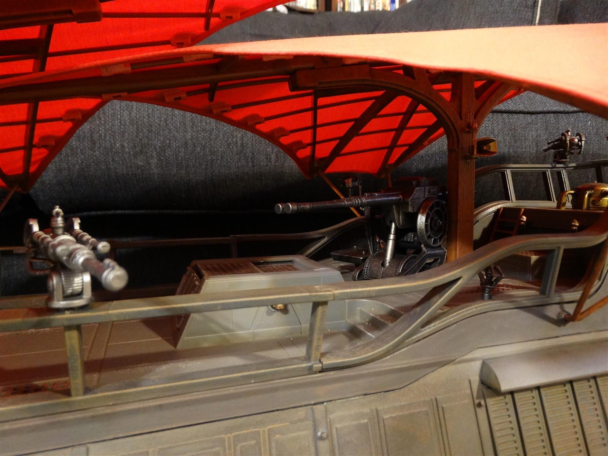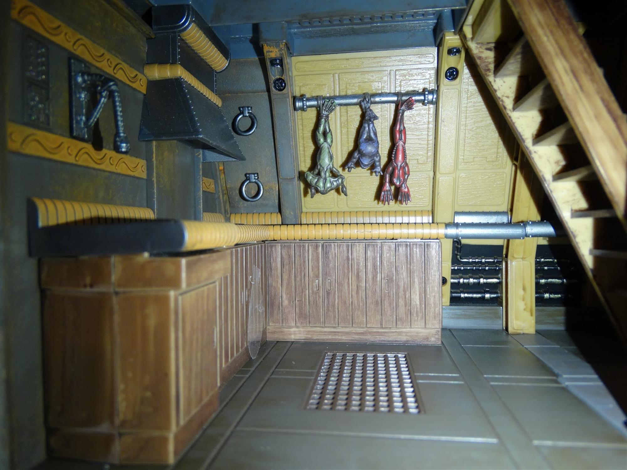 The next compartment over is home to the Sail Barge’s galley and armory, where alien chefs can cook up odd-looking amphibians and skiff guards can store their various weaponry. There’s also steps leading up to the deck and hatches that swing open to allow movement around the craft.