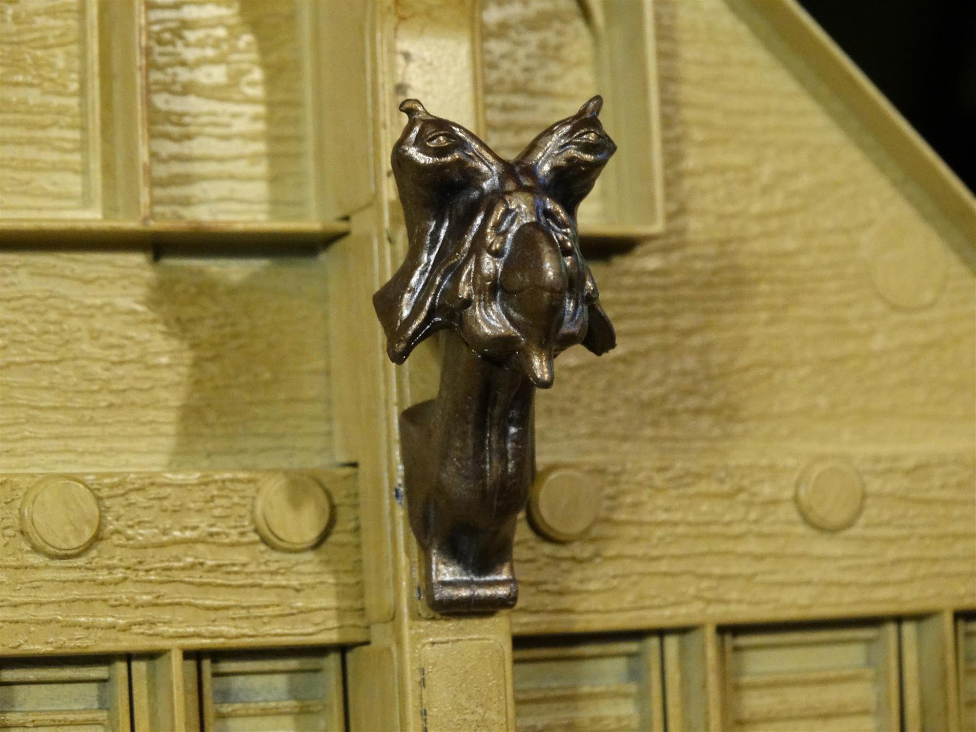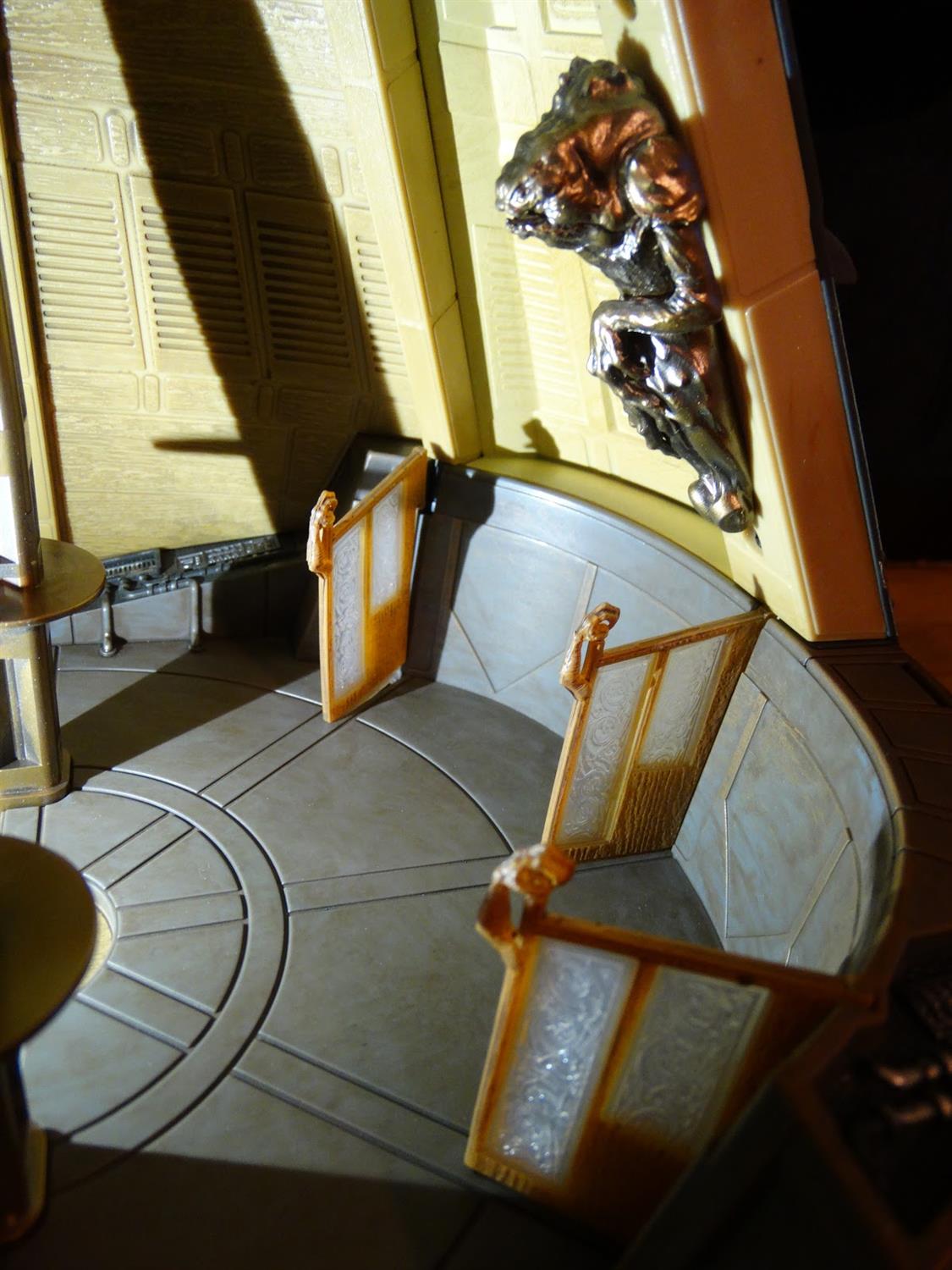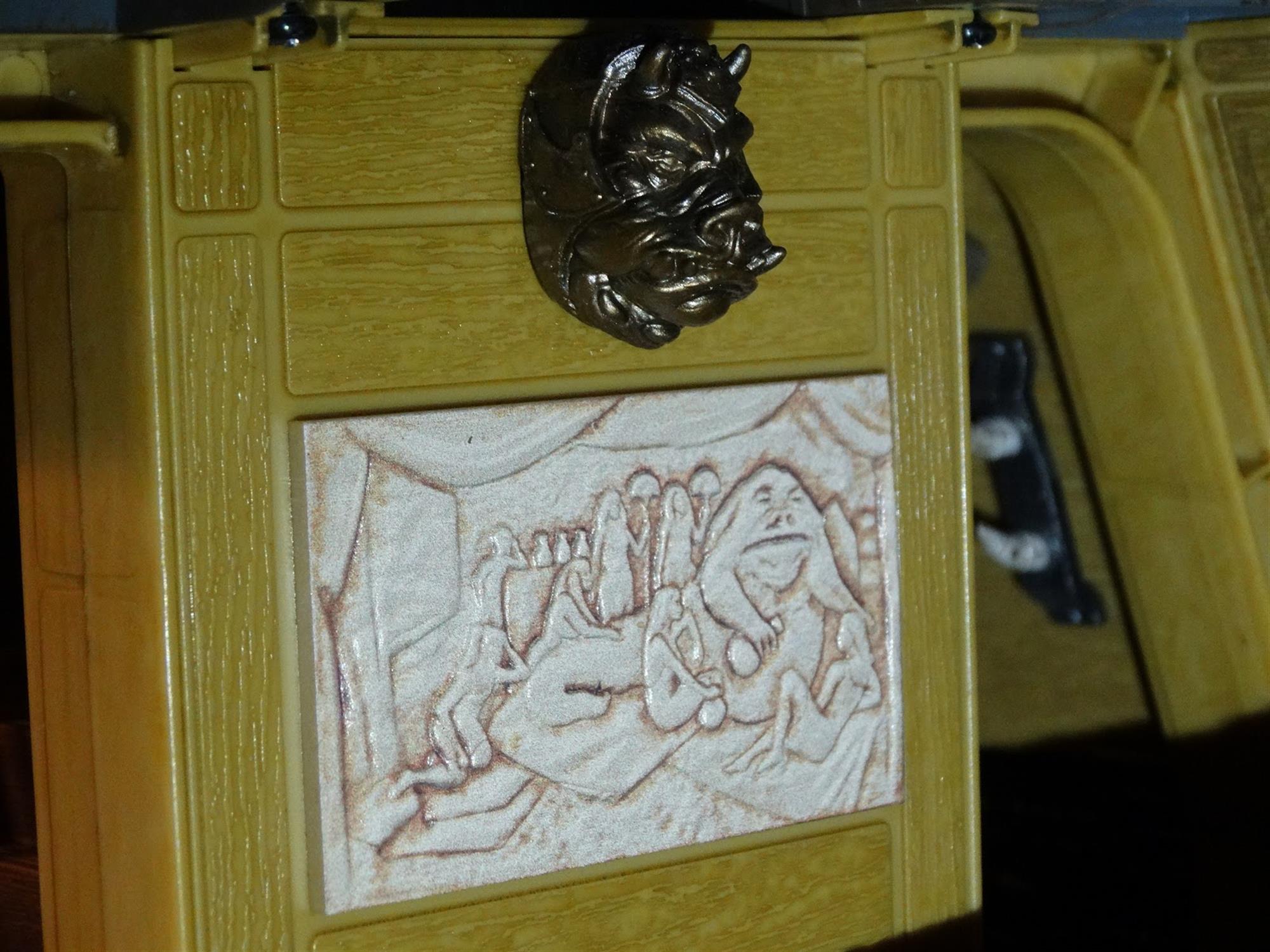 Also near the armory, a smuggler’s hatch allows for storage of illicit goods or spices Jabba might want to keep concealed. Speaking of Jabba, his chamber is in the stern section of the giant barge, and the slimy gangster hides out back there on his dais, which can slide back and forth to “scan for shady denizens,” according to the playset’s instruction manual. There’s also a bas relief portrait of the Hutt surrounded by attentive female servants (taken right out of the background of a shot from Return of the Jedi) and bronze sculptures of a Gamorrean, an Ishi Tib, and a Rancor.