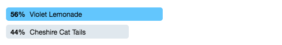 Before we move on to today’s matchup, let’s take a look at our last result. In our final matchup of the first round, Violet Lemonade won a close one to move on to the finals of the Instagram-Worthy region, beating the Cheshire Cat Tail by just 12%.