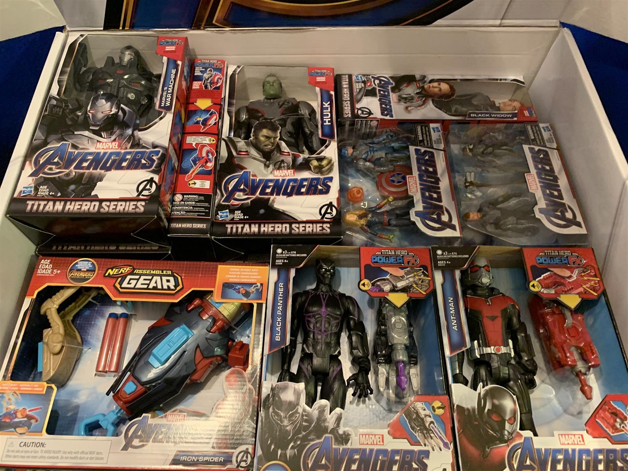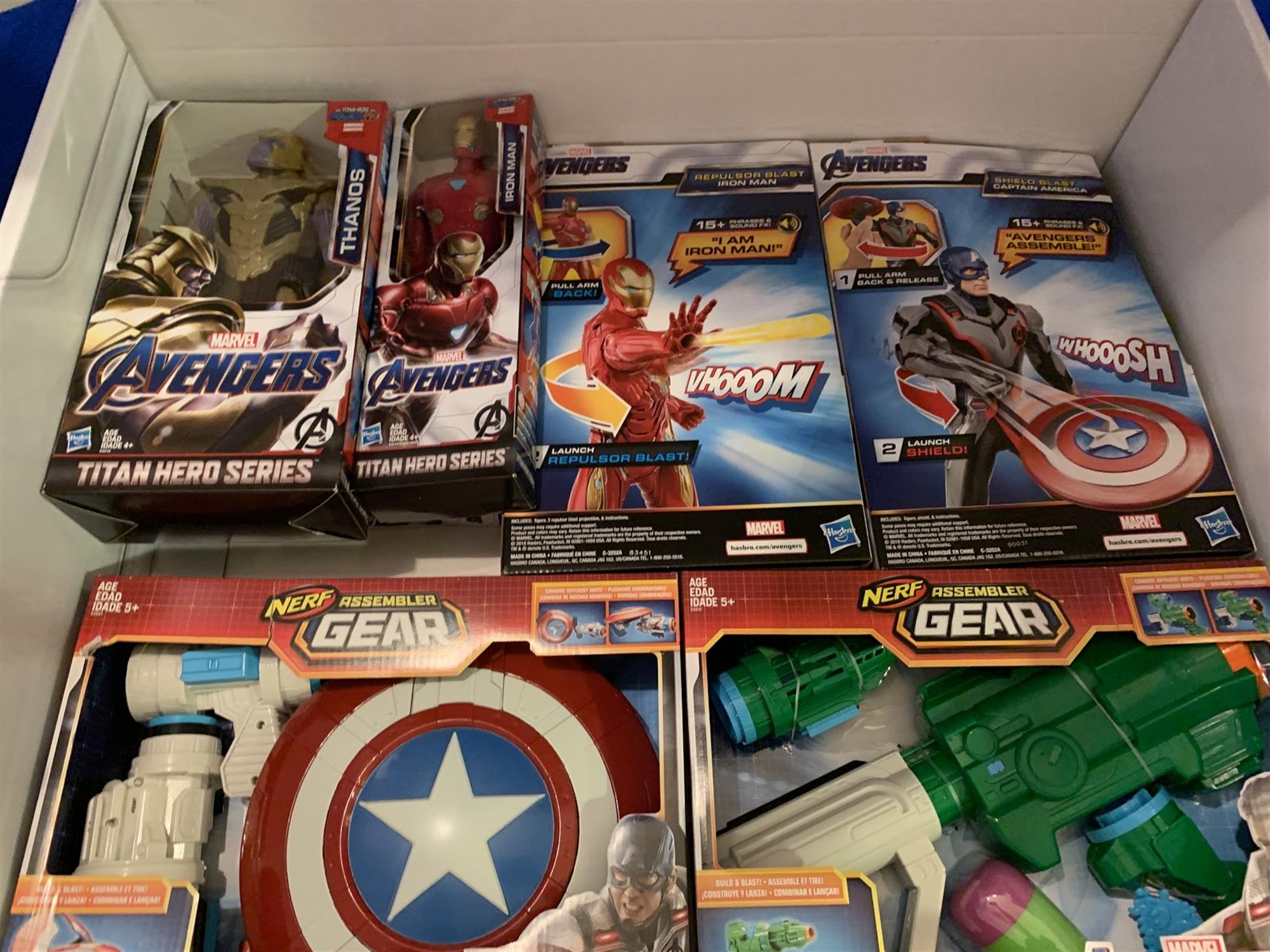 Opening the box revealed three layers of toys that include that latest wave of Marvel Legends figures, Titan Heroes, action figures, motion figures, and Nerf weapons.