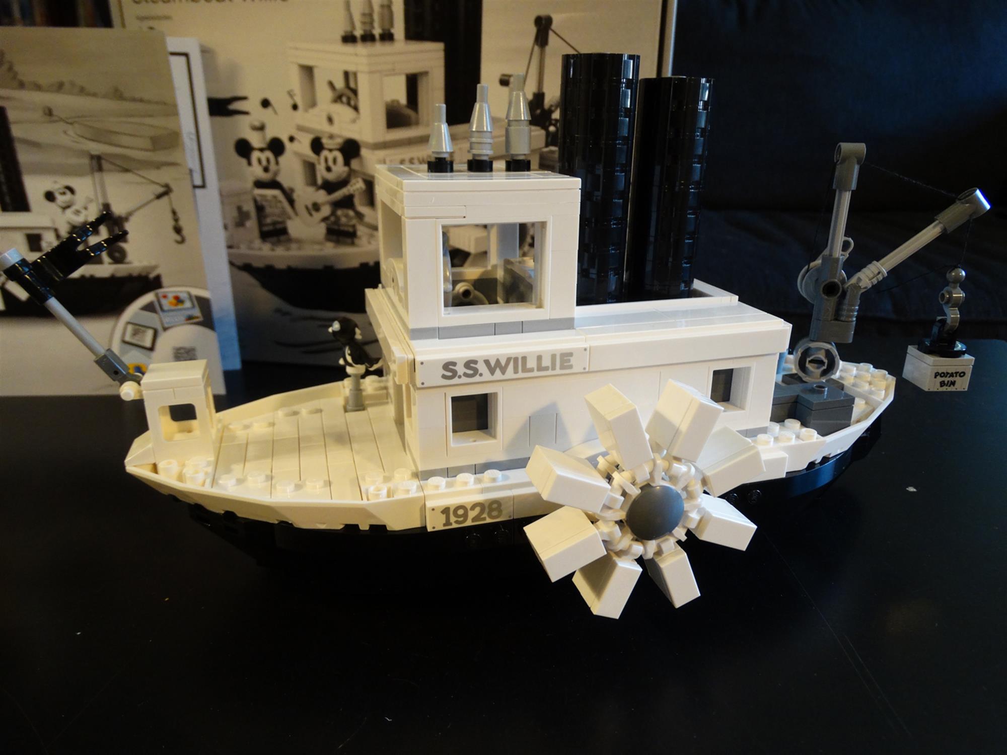 Movie Steamboat Willie forward and backward on a flat surface causes the aforementioned paddle wheels to rotate and the steam pipes to move up and down in an alternating manner. The ship also features a working crane with a crank that allows builders to load a potato bin on and off the deck, a pot and pan, and a spinning steering wheel as seen in that iconic sequence from the film.