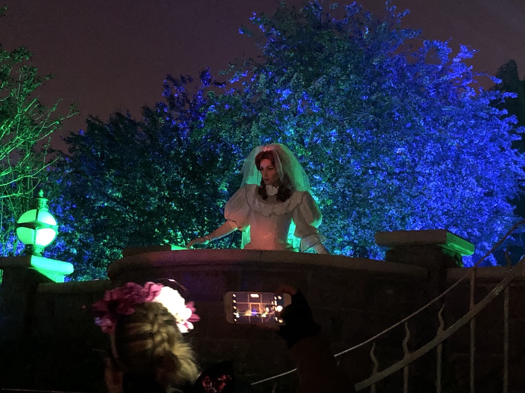 After riding the attraction, we exited to find Ms. Ravenswood had materialized outside of the Manor! Unfortunately, her appearance is not a regular feature of the attraction, she was special for this event, but she was a real walkaround character.