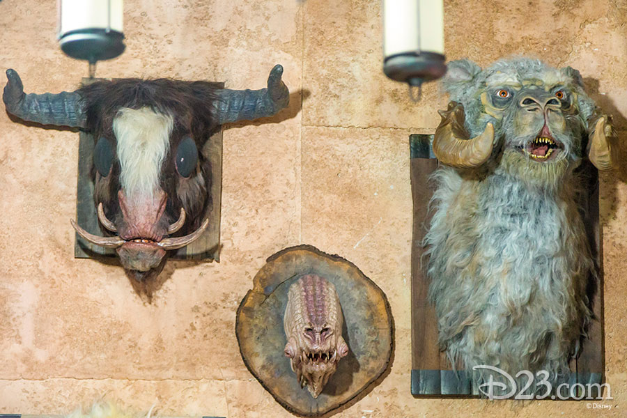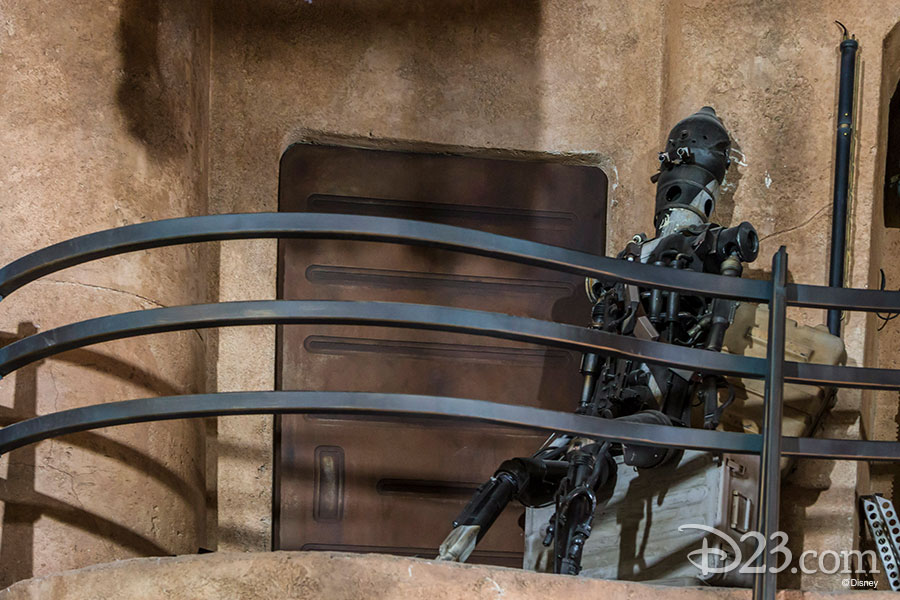 Dok-Ondar’s Den of Antiquities will host countless Star Wars artifacts, such as the mounted taxidermied heads of creatures seen two images above (from right to left that’s a Tauntaun, what looks like a baby Rancor, and could that be a Moof?) and the IG-series assassin droid perched on a crate atop a railed balcony. Perhaps this deadly droid is biding his time, waiting to strike when his bounty approaches.