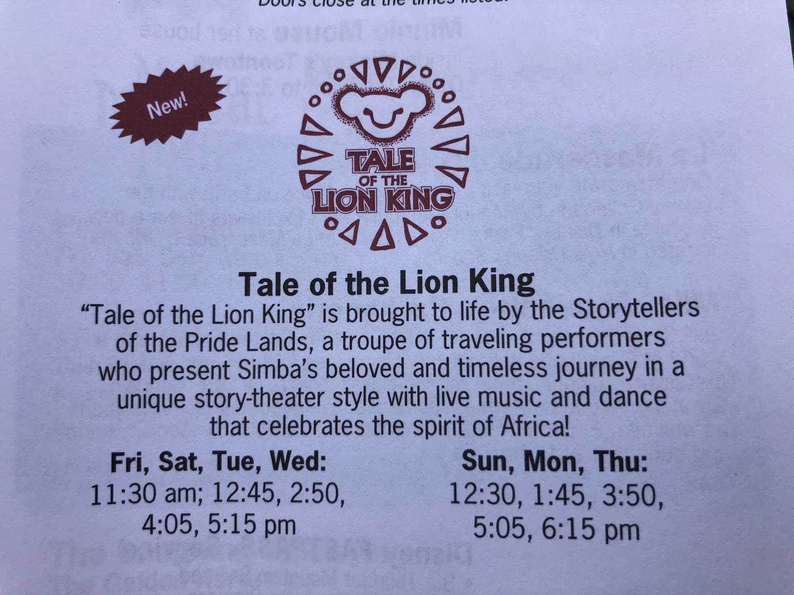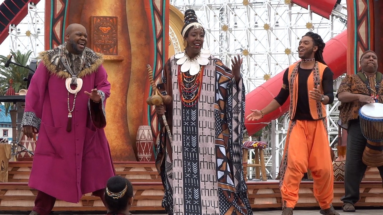 The show features a cast of eighteen performers referred to as The Storytellers of the Pride Lands, who specialize in retelling legendary stories in their own style. Together they bring to life the saga of Simba, Mufasa, Scar, Nala, Timon and Pumbaa in the excellent twenty-five minute show “Tale of The Lion King.”