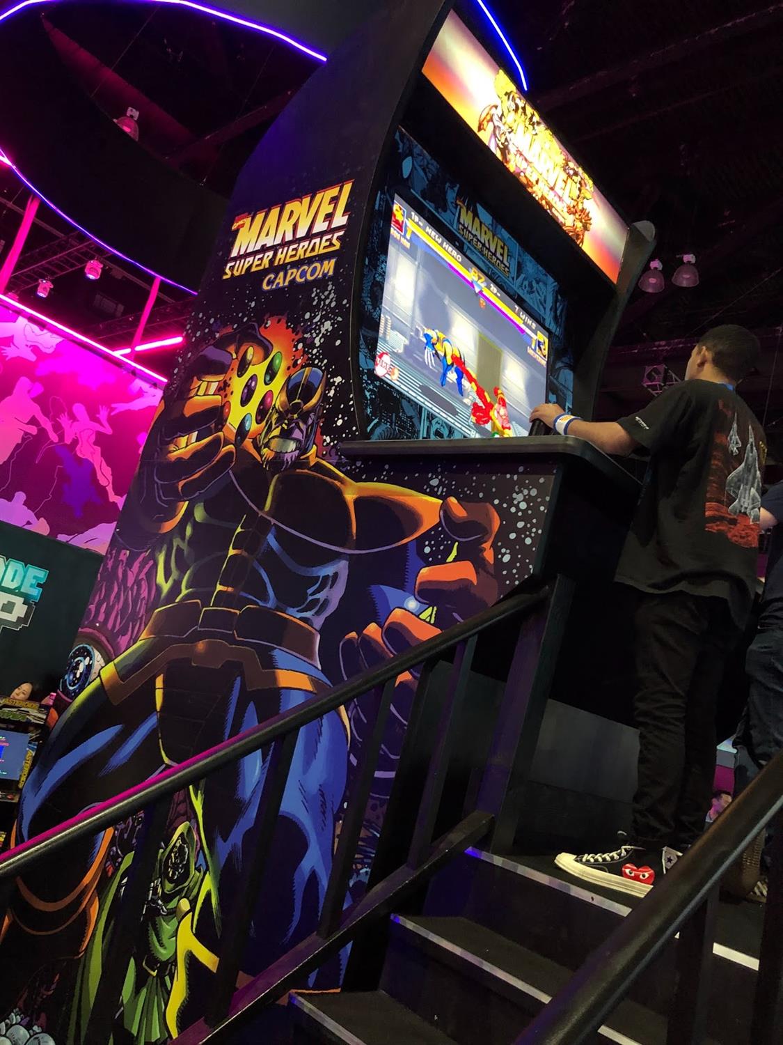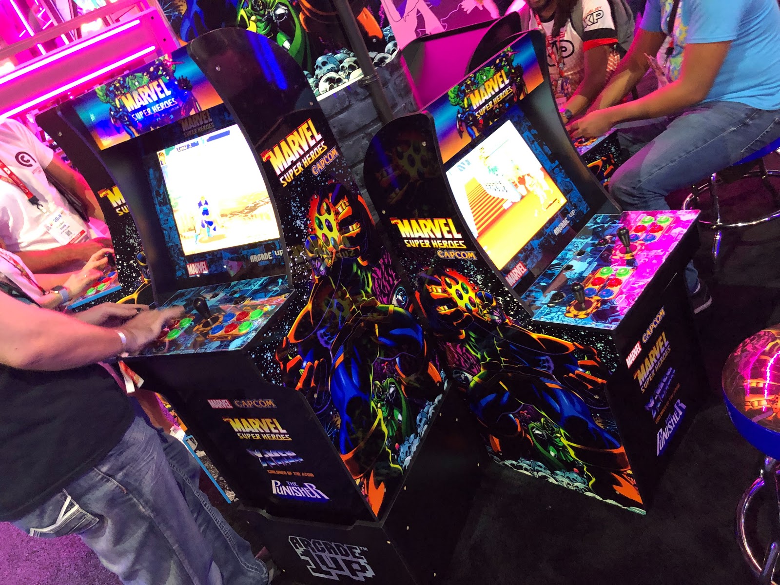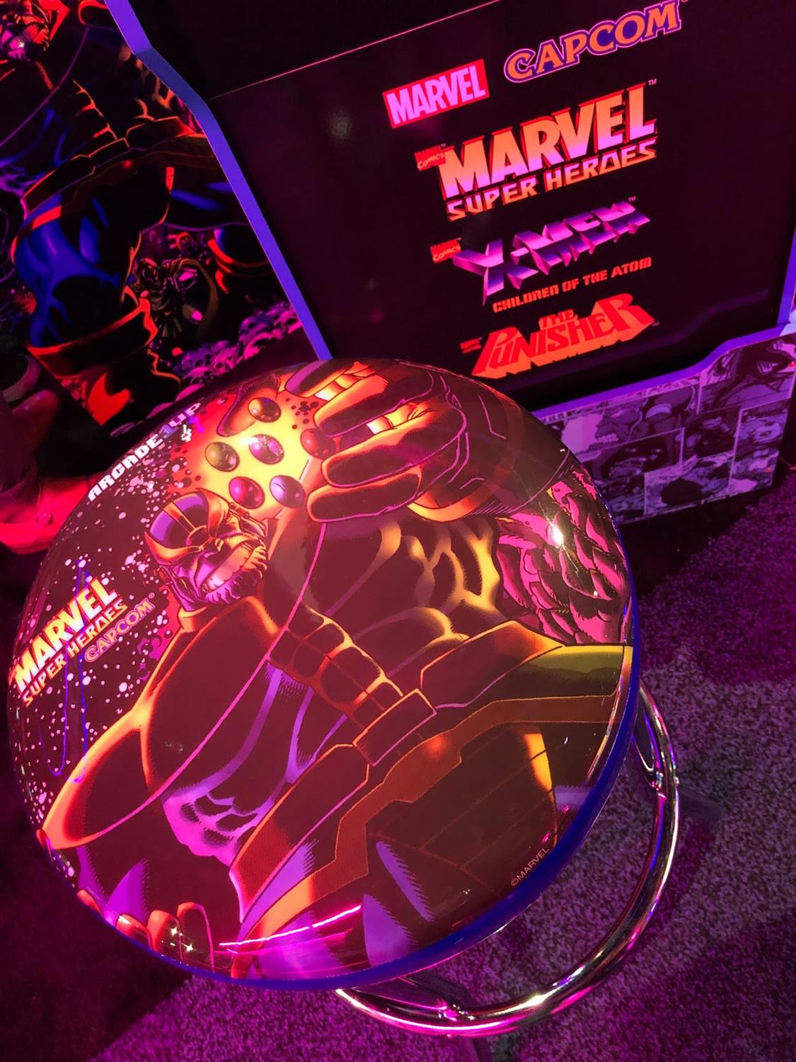 During my visit to Arcade1Up’s booth at E3 2019 to check out the newly unveiled Atari Star Wars cabinet, I also got a look at and some hands-on experience with the above-mentioned Marvel Super Heroes title, plus the licensed Thanos stool and cabinet stand, which are all incredibly cool and will be must-haves for fans of the Marvel Comics characters and the groundbreaking Capcom games Marvel Super Heroes (1995), X-Men: Children of the Atom (1995), and The Punisher (1993).