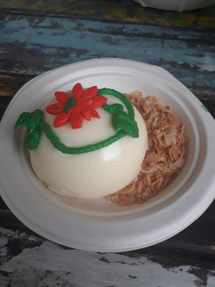 The flower was just straight colored sugar and the vines are carrot flavored royal icing. It's a gelatin coconut cake that tastes exactly like Snoball snacks.The Pineapple nougat and coconut cake base make it a delicious dessert to compliment any entree from Harambe Market at an equally delicious price of $4.99.