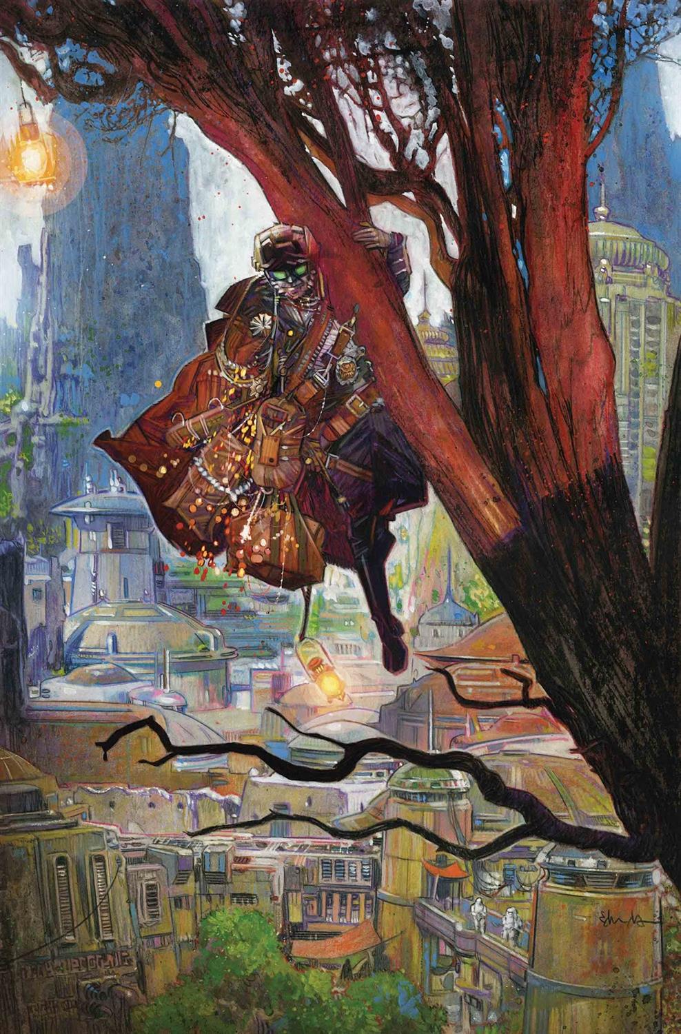 Hondo and Dok, it seems, have a history together, having once traveled to the planet Jedha (as first seen in Rogue One: A Star Wars Story) to collect a rare Kyber Crystal statue carved by a Jedi’s lightsaber. A flashback to these events takes up most of this issue’s action, as Hondo relates the tale to Kendoh while fending off her double-double-cross. Along the way, the pirate and the collector face off against the Guardians of the Whills, including the character Chirrut Îmwe, played by actor Donnie Yen in Rogue One.