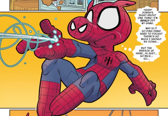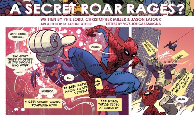 Jumping back to Spider-Man: Into the Spider-Verse, the second story in this comic comes from the writers/producers of the animated film: Phil Lord and Christopher Miller, in conjunction with Latour. The group continues to cram in the jokes in this second story.