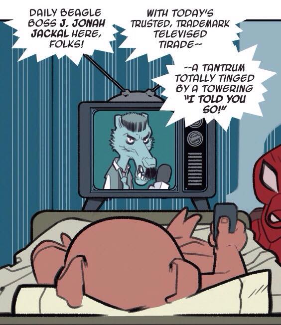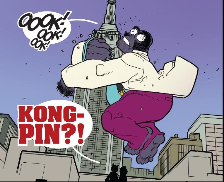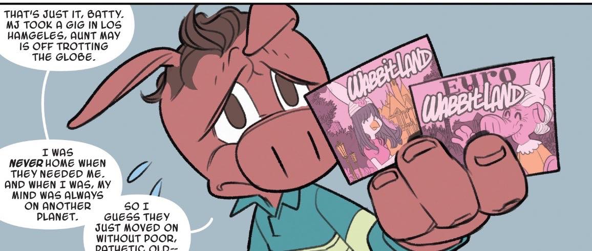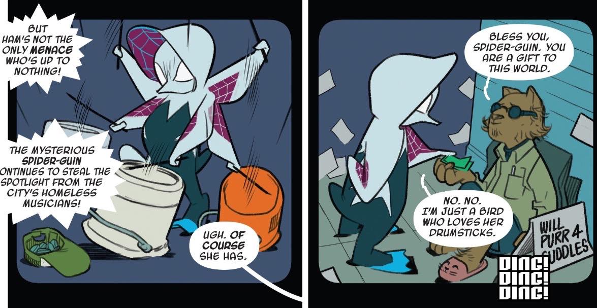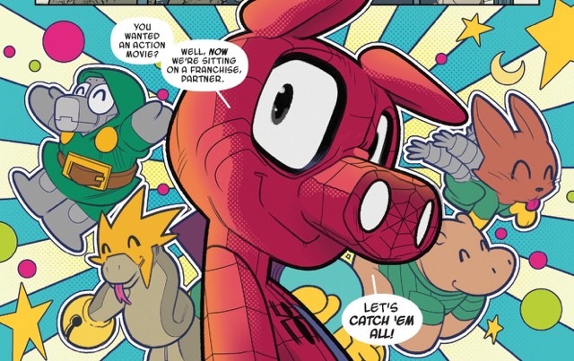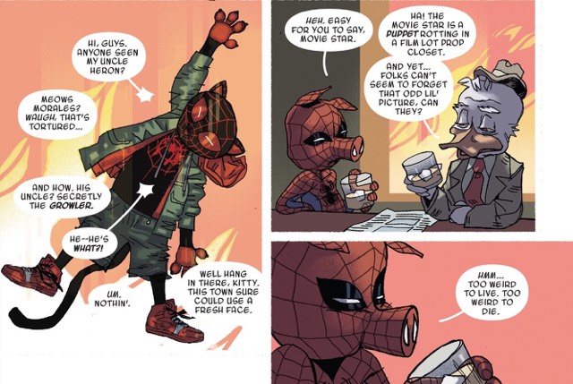 Countless animal puns flash in the background of this story, including Meows Morales, who actually gets a couple of lines in. Porker and Howard even discuss the 1986 film Howard the Duck.