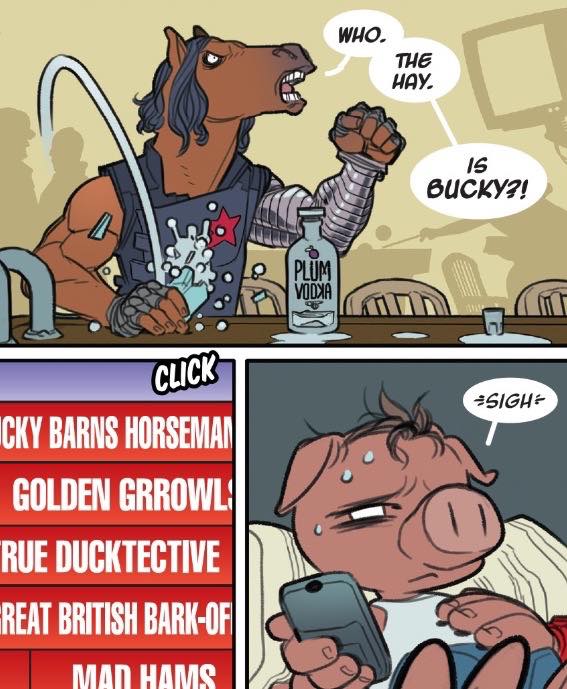 This story even features a reference to Disney parks, both in the US and in Europe, as well as a reference to a totally unrelated but still very popular video game, movie and tv franchise. Another panel crams in the animal puns by featuring a tv listing while an adjacent panel features a subtle reference to the MCU while making a not-so-subtle additional animal pun. Notice the “Plum Vodka,” a reference to those plum Bucky never got to enjoy in Captain America: Civil War.