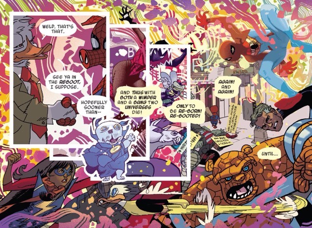 While a war rages in the streets between our classic Marvel heroes and their animal counterparts, Spider-Ham steps into a bar where he grabs a drink with Howard the Duck. The pair has a very deep conversation, the subject matter of which is actually incredibly dark, but of course they manage to do it in hilarious fashion, even going as far as to reference the fact that no one ever really dies in a comic book.