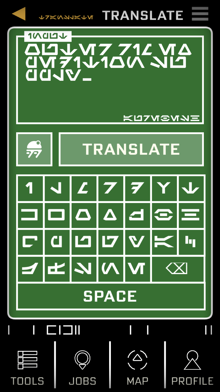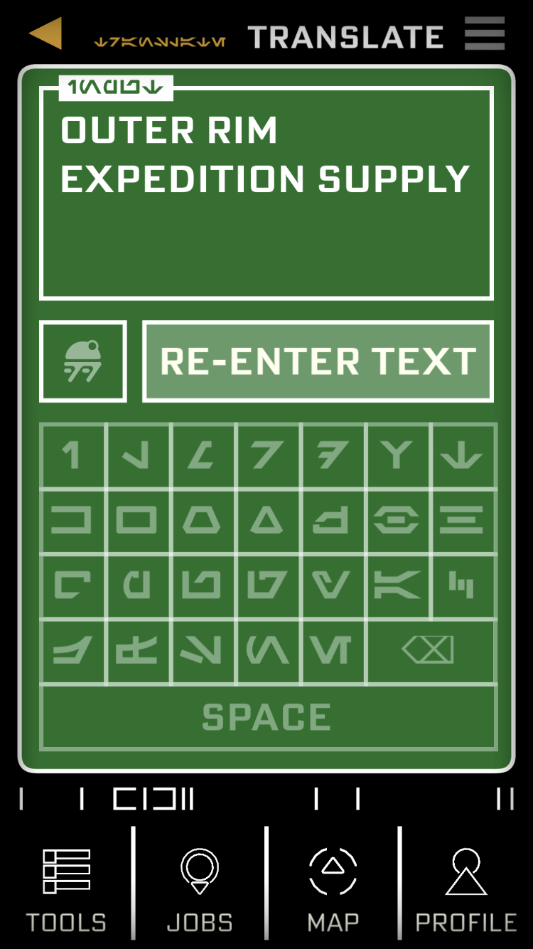 - Translate - Confused by the strange alien symbols you see on the buildings around you? This is the fictional Star Wars alphabet called Aurebesh, and you can use the app to translate it by typing in each character individually and then pressing a button to transform it into English. At first there was also a way to use your phone’s camera to scan in the text, but that function was removed almost immediately after Galaxy’s Edge opened, as it wasn’t functioning as intended. Hopefully it will be updated and returned to the app soon.