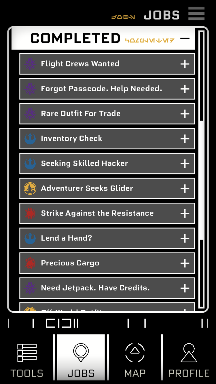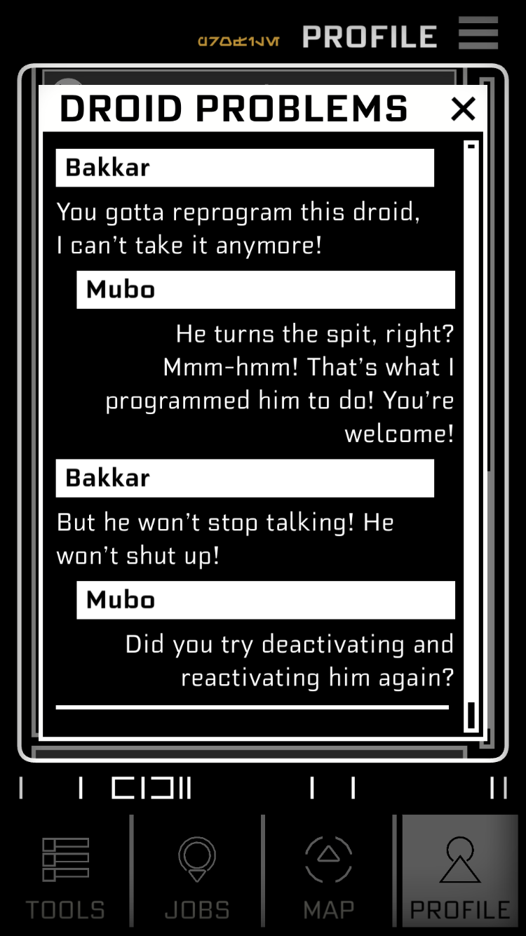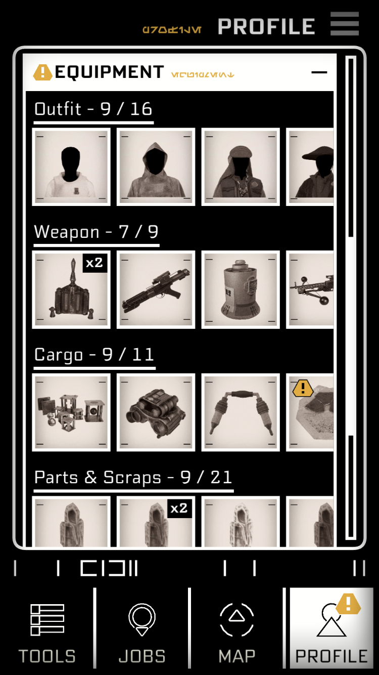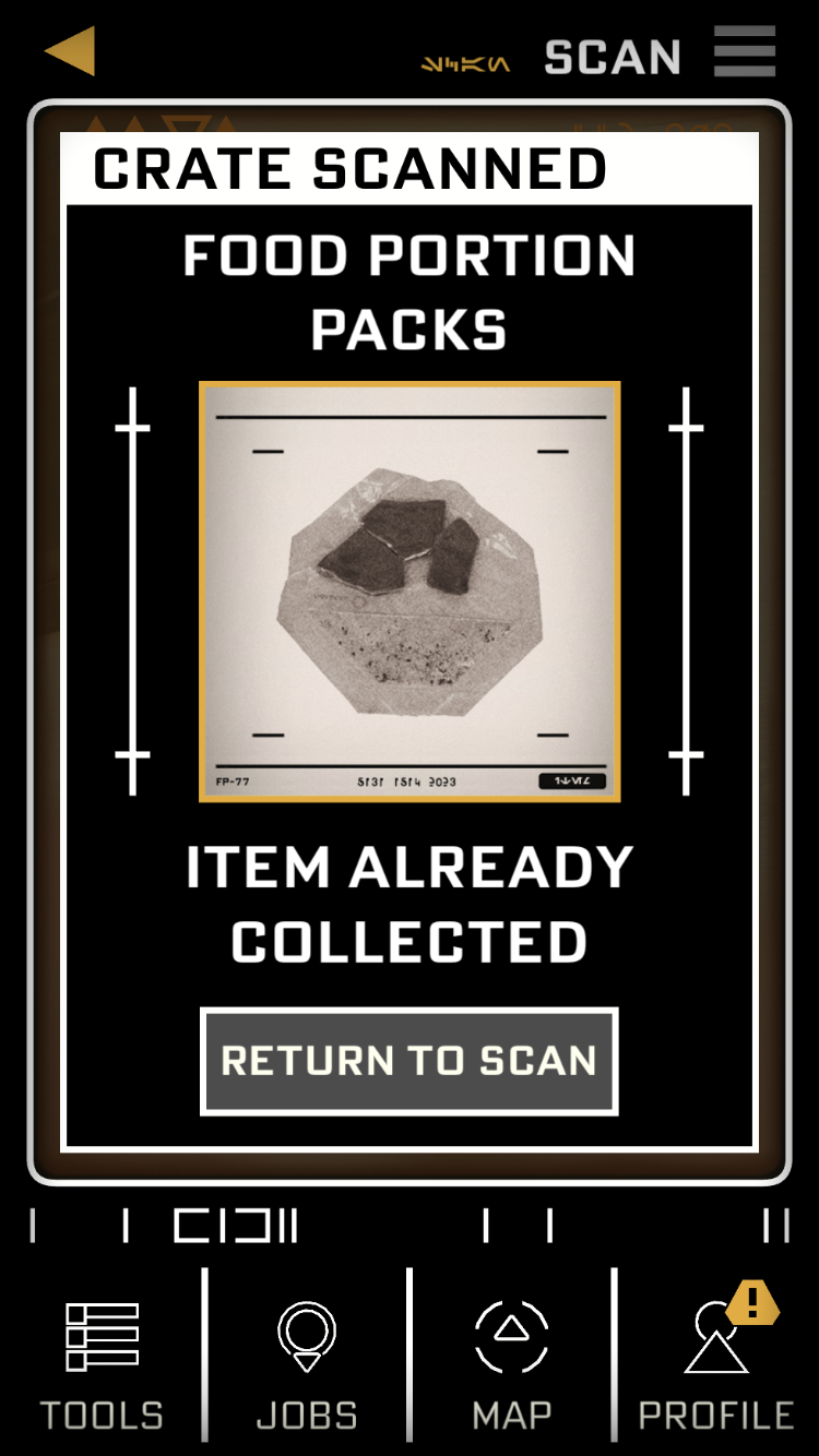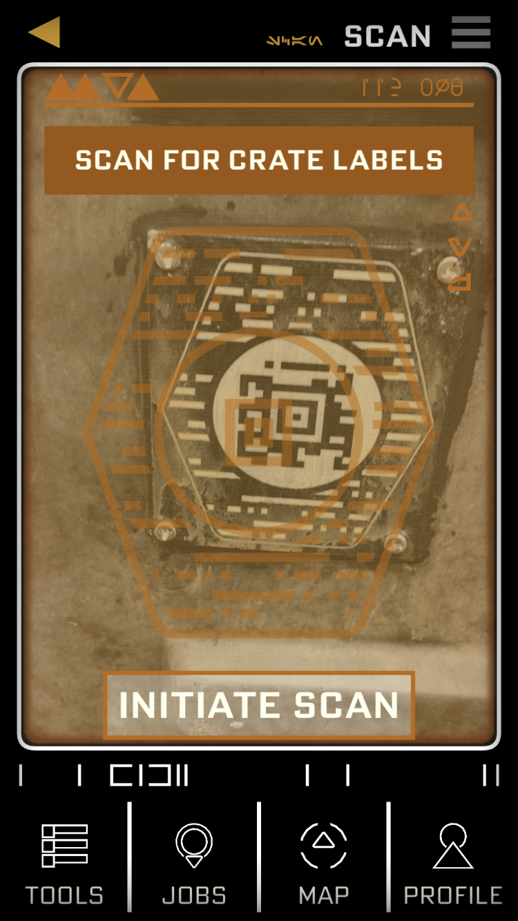 - Scan - Use your phone’s camera to read QR code labels on crates around the Spaceport, Merchant’s Row, and other areas to virtually claim the item inside and add it to your collection within the app. This function comes up a lot when completing jobs for various characters (see JOBS section below).