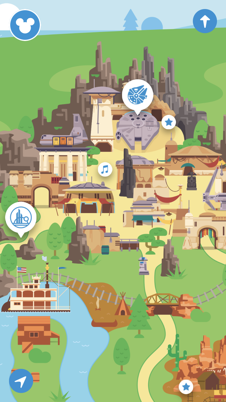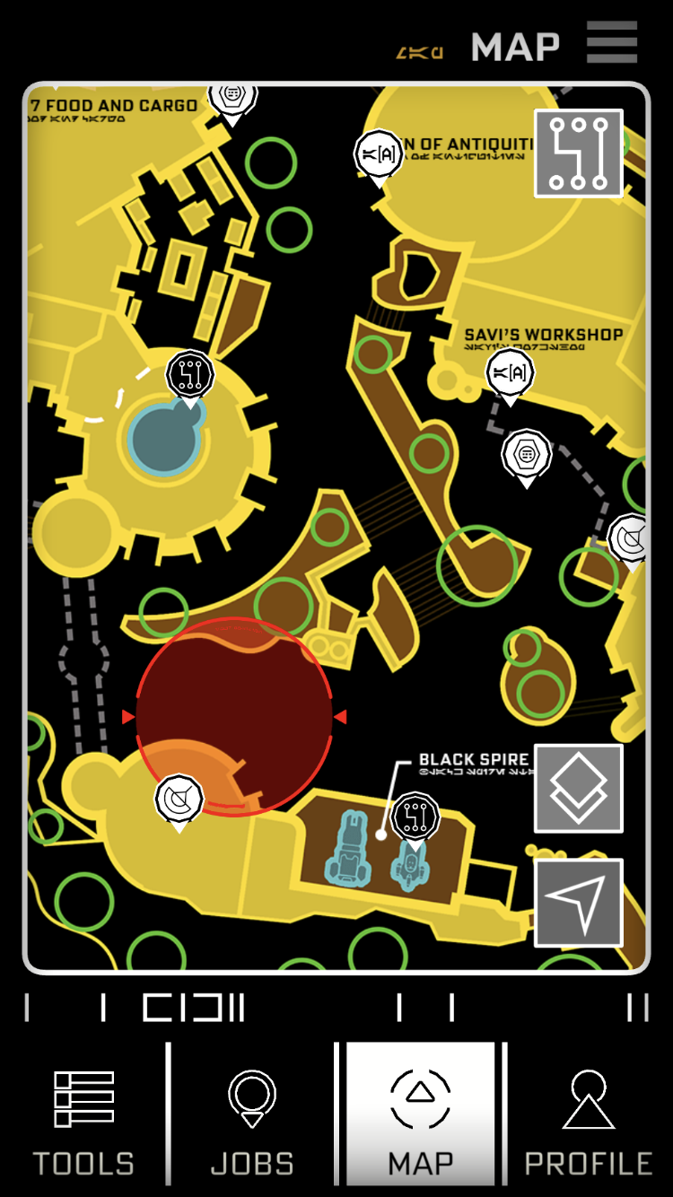 Pretty self-explanatory: this is an interactive map of Batuu with points of interest and app-activated locations indicated. You also get a handy “You Are Here” marked by the red circle as seen in the following image.