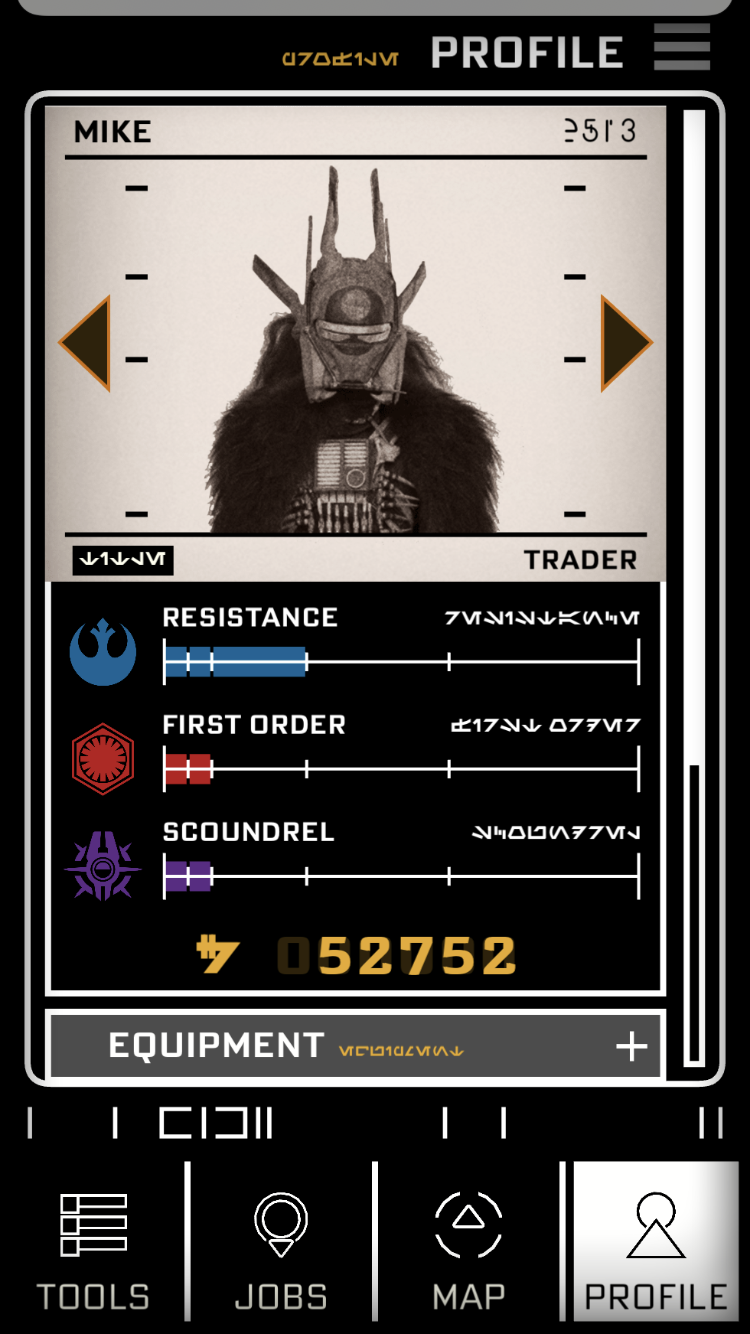 This is the only part of the Star Wars Datapad that is still accessible while you are off-planet (read: anywhere but within the borders of Star Wars: Galaxy’s Edge). It displays your name, affiliation levels to the Resistance, First Order, and Scoundrels groups, and finally all the costumes, equipment, star maps, schematics, droid data, transmissions, and titles you’ve accumulated by completing the above tasks.