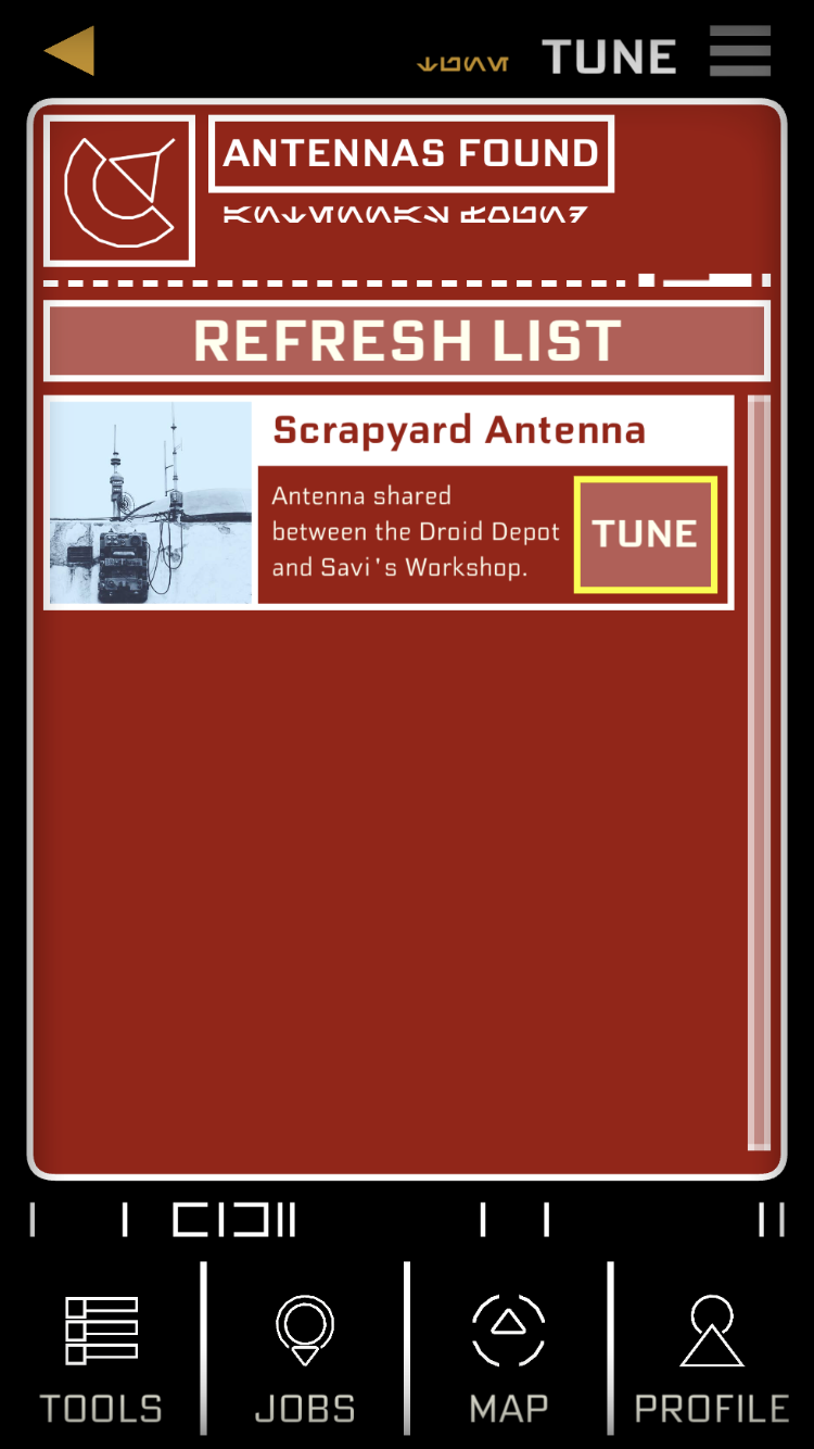 - Tune - Find a broadcast signal, move your phone to pinpoint its location, and solve a quick puzzle to intercept a transmission from one of the many denizens of Batuu.