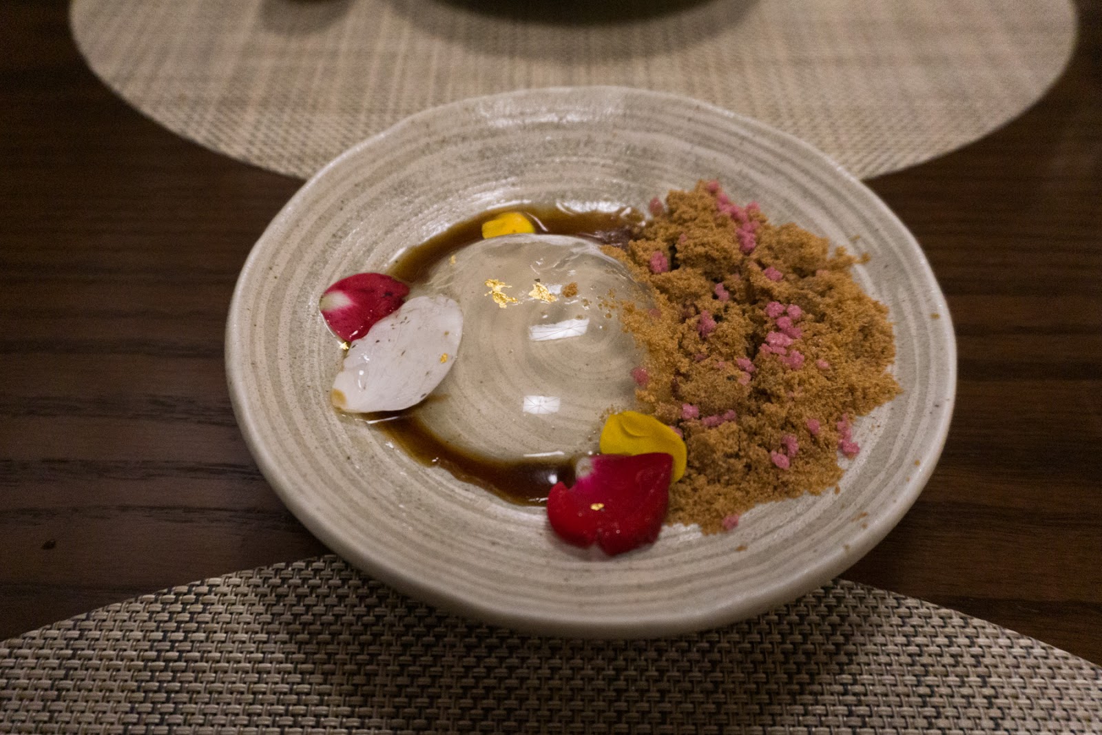 As tough as that steak was to follow, we did try one of the desserts as well. The Suiren Dani is a Japanese Water Cake with sake-infused rose petals, rose sugar, a Japanese sugar syrup and a soy bean crumble. I know this dish sounds and looks bizarre but I promise it is delicious and surprisingly refreshing for a dessert.