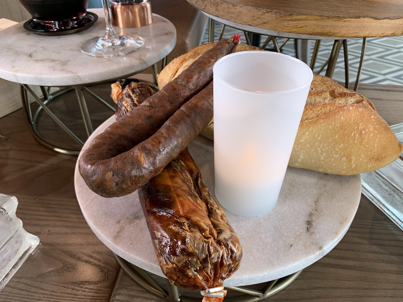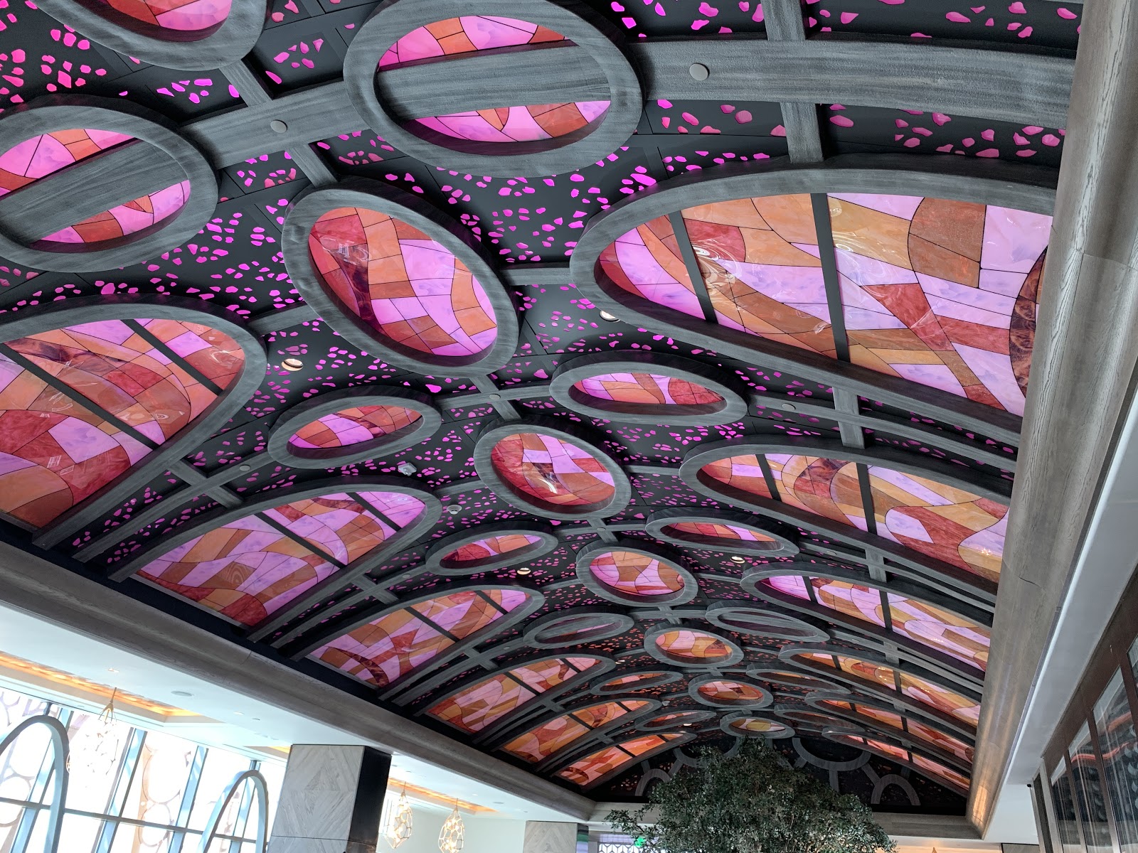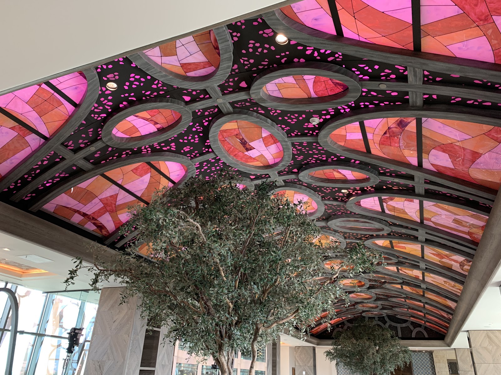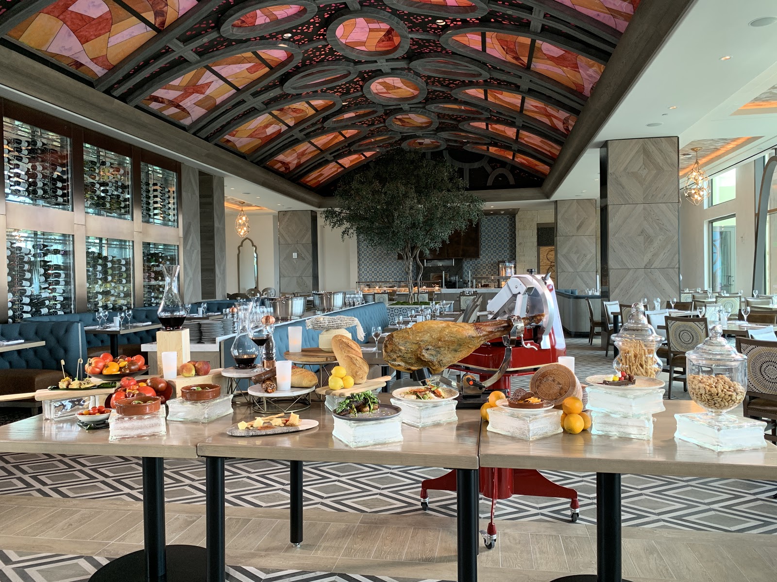 The restaurant is named after the Spanish city that was home to avant-garde writers and artists in the 1920s and ‘30s, therefore it is fitting that the decor features surrealistic touches. Inside, the restaurant features a pair of large olive trees that sit below an intricate vaulted ceiling with stained-glass accents.