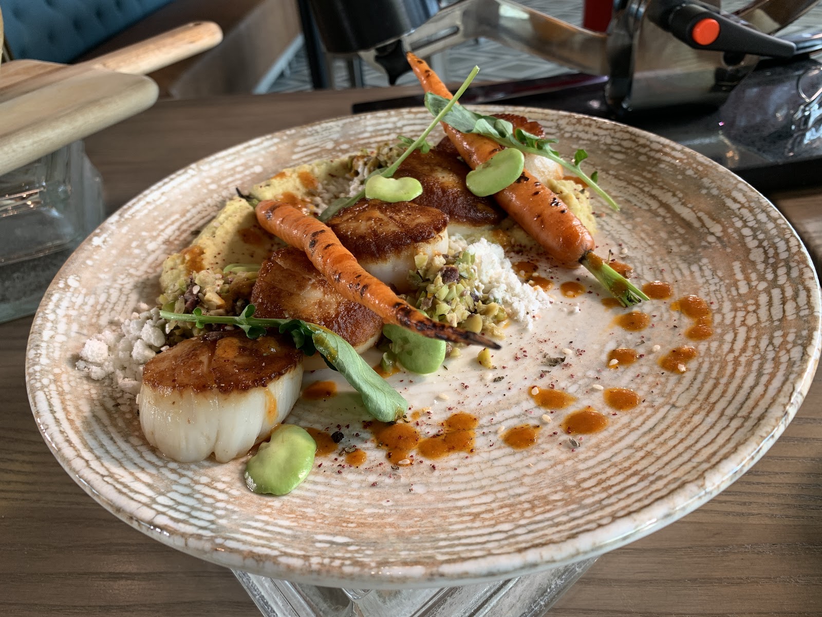 - Spanish sides include bravas (potatoes) with pimento aioli, braised gigante beans with aged sherry vinegar, and roasted cauliflower with harissa vinaigrette.