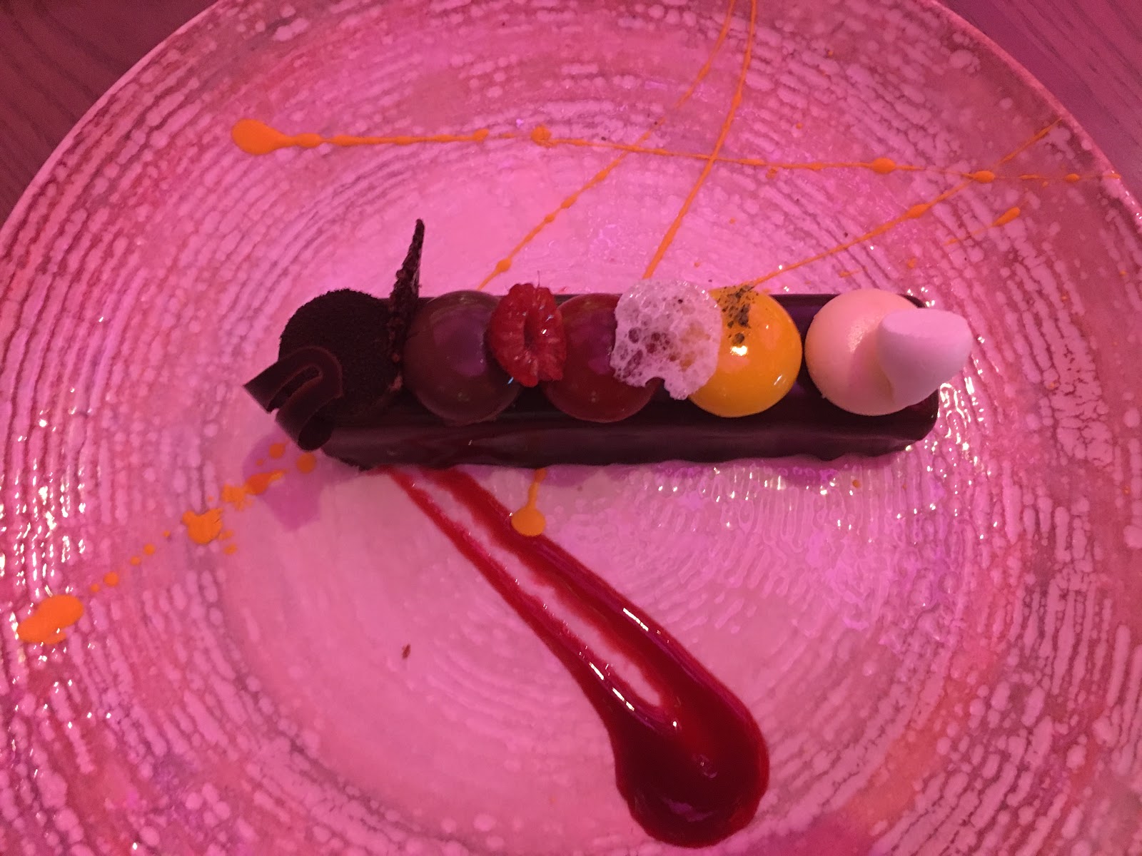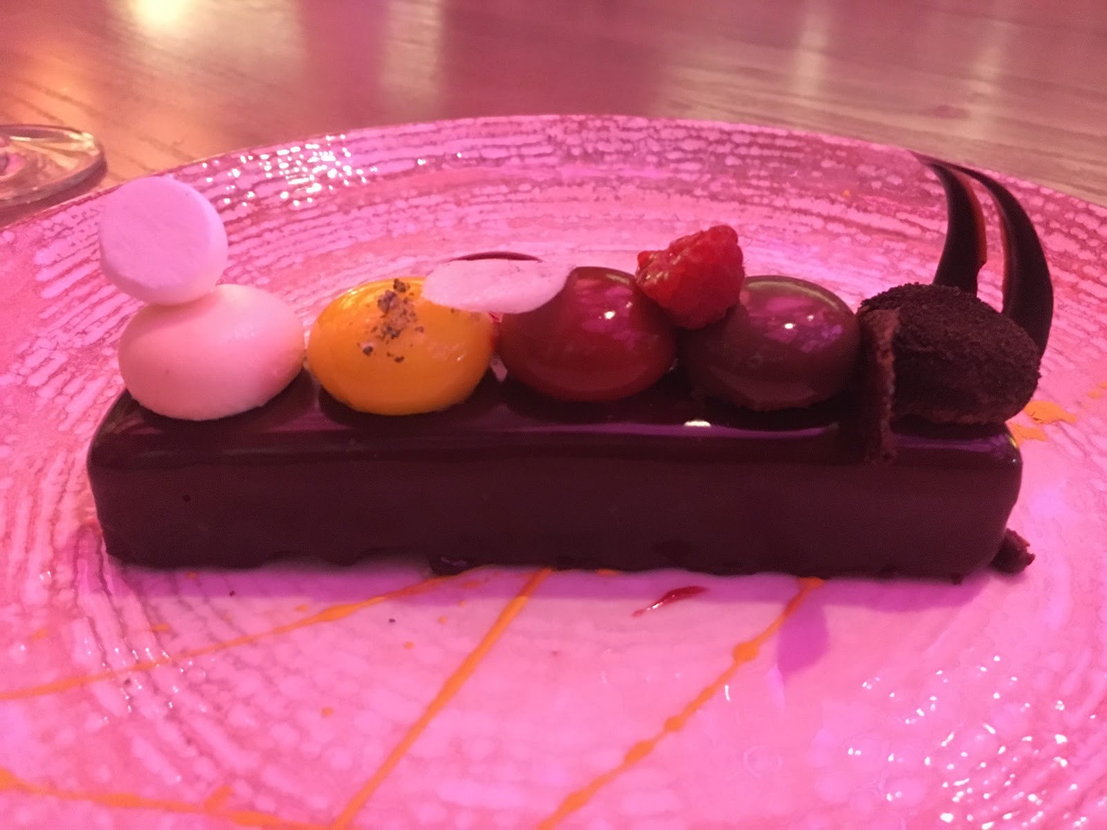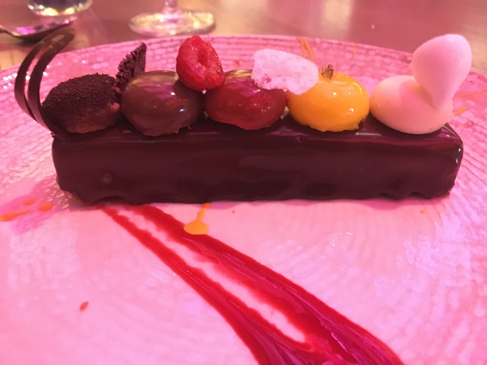On to dessert. When a dessert menu offers an option that features a tasting of five different flavors, you order that dessert. Naturally, we tried The Toledo Tapas Bar, which consisted of a dark chocolate bar topped with small tastes of five different flavors, including Spanish coffee, crunchy chocolate, raspberry mousse, lemon curd and cheesecake.