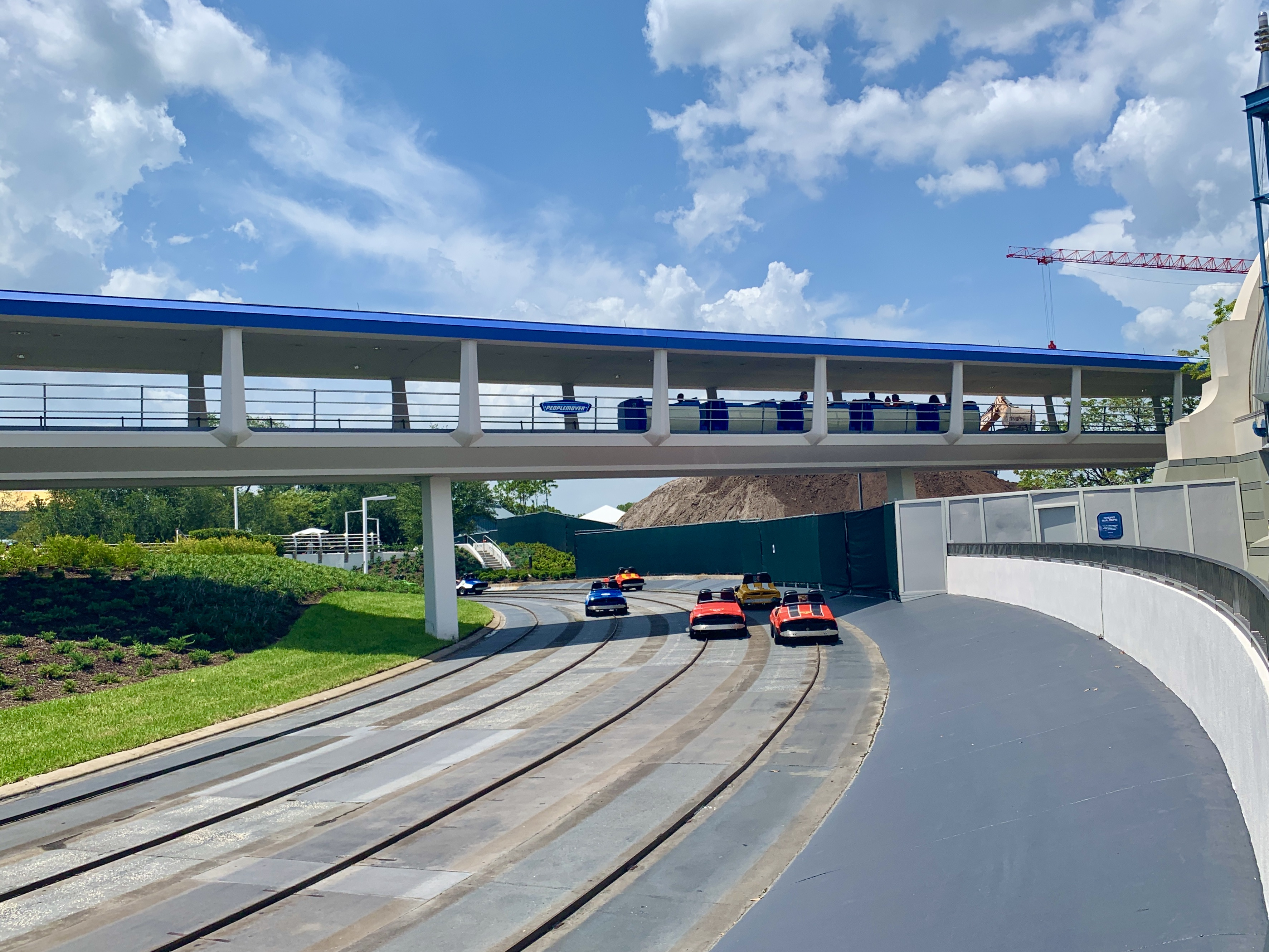 While no official date has been announced, we can tell from construction progress there is still a lot of work to happen, including building the entire show building but the canopy and reworking of the train tracks and walkways in the area.