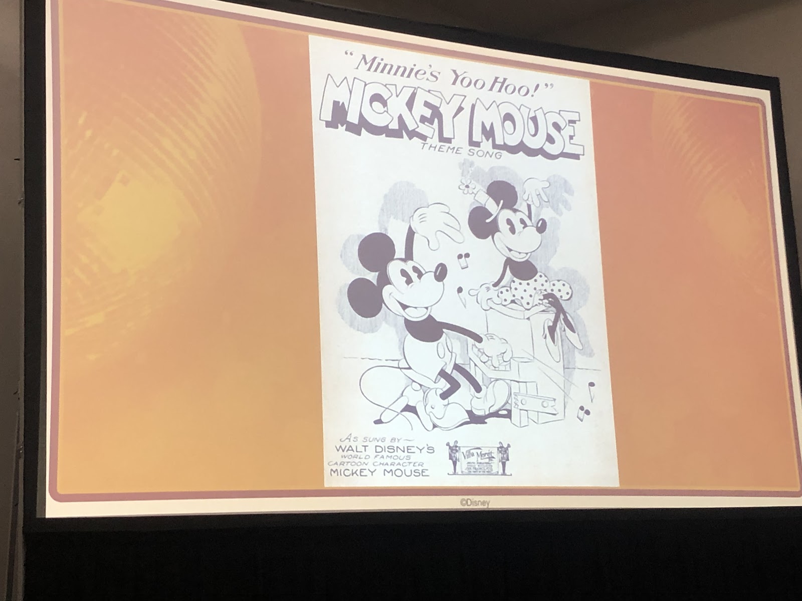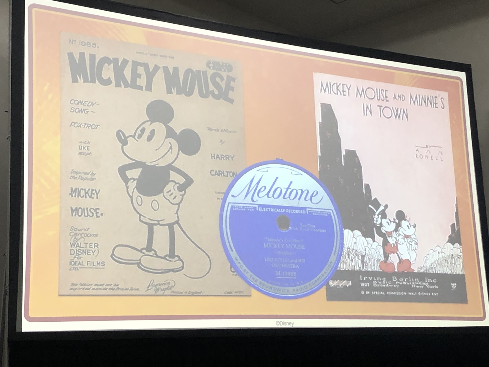 The panel started with a review of Mickey Mouse’s relationship with music over the past ninety years, beginning with the classic Walt Disney Studios short Steamboat Willie (1928) and working their way through Fantasia (1940), The Mickey Mouse Club (1955), Mickey Mouse Disco (1979), Mousercise (1982), Mickey Mouse Splashdance (1983), and Totally Minnie (1988), in addition to other lesser-known vinyl and sheet-music releases.