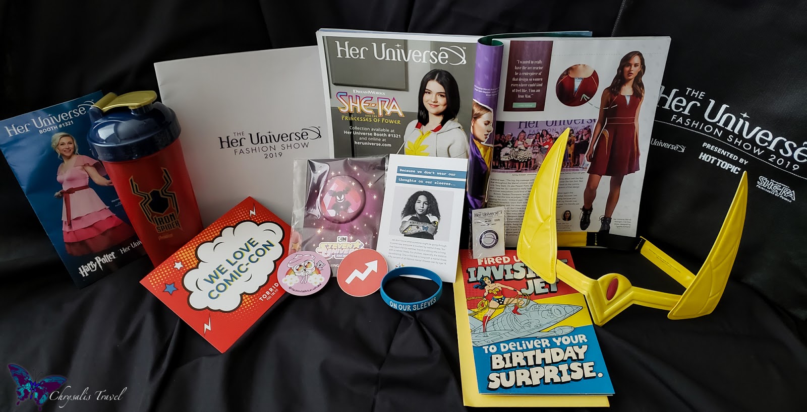 This year, the bags included She-Ra swords or tiaras…empowering us all to join in. A copy of Pop Insider magazine featured an article on Her Universe, and a back cover feature. Performa provided a Marvel Avengers ‘Iron Spider’ shaker bottle. Coupons, pins, buttons, and stickers rounded out the gifts.