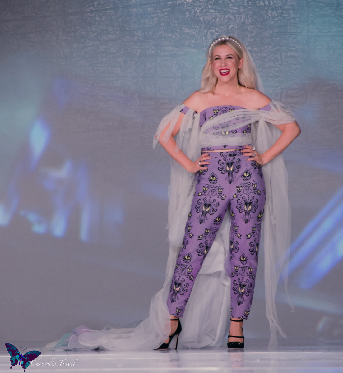 Judge Ed Labay and co-host Tiffany Smith called upon Madame Leota to introduce Disney’s Haunted Mansion fashion line for Hot Topic. Answering the call, Ashley materialized in a Haunted Mansion-themed bridal pantsuit.