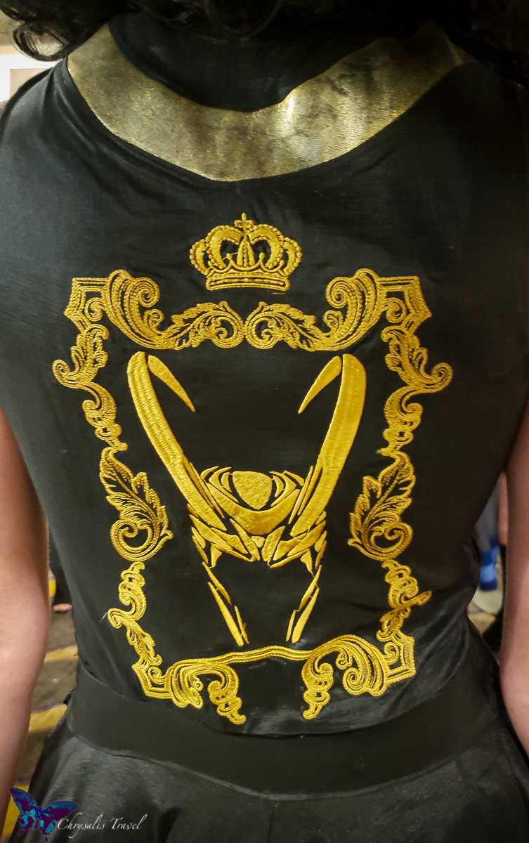 Gold foil accents trimmed the skirt, with Loki helmets printed on the interior lining of the skirt.
