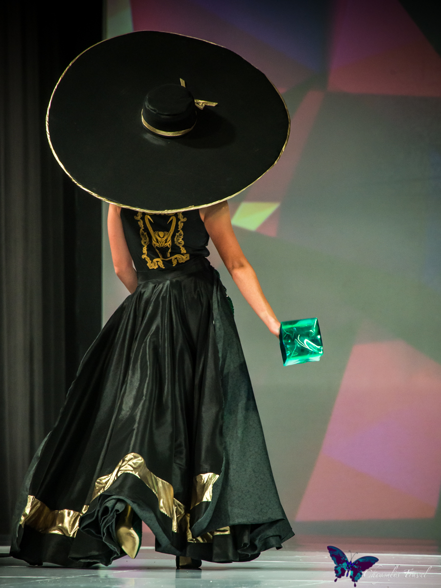 Sarah is also a self-taught designer, and a four-year veteran of the Her Universe Fashion Show. Her entry was a Loki-inspired silk taffeta pantsuit with a flowing skirt and wide-brimmed hat.