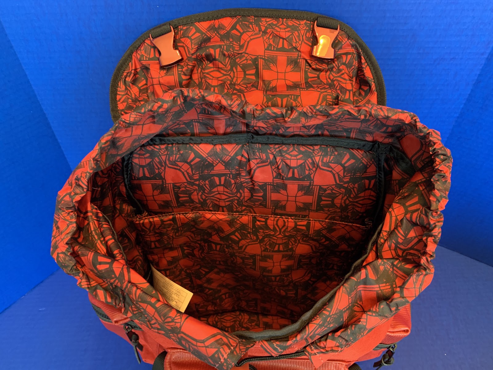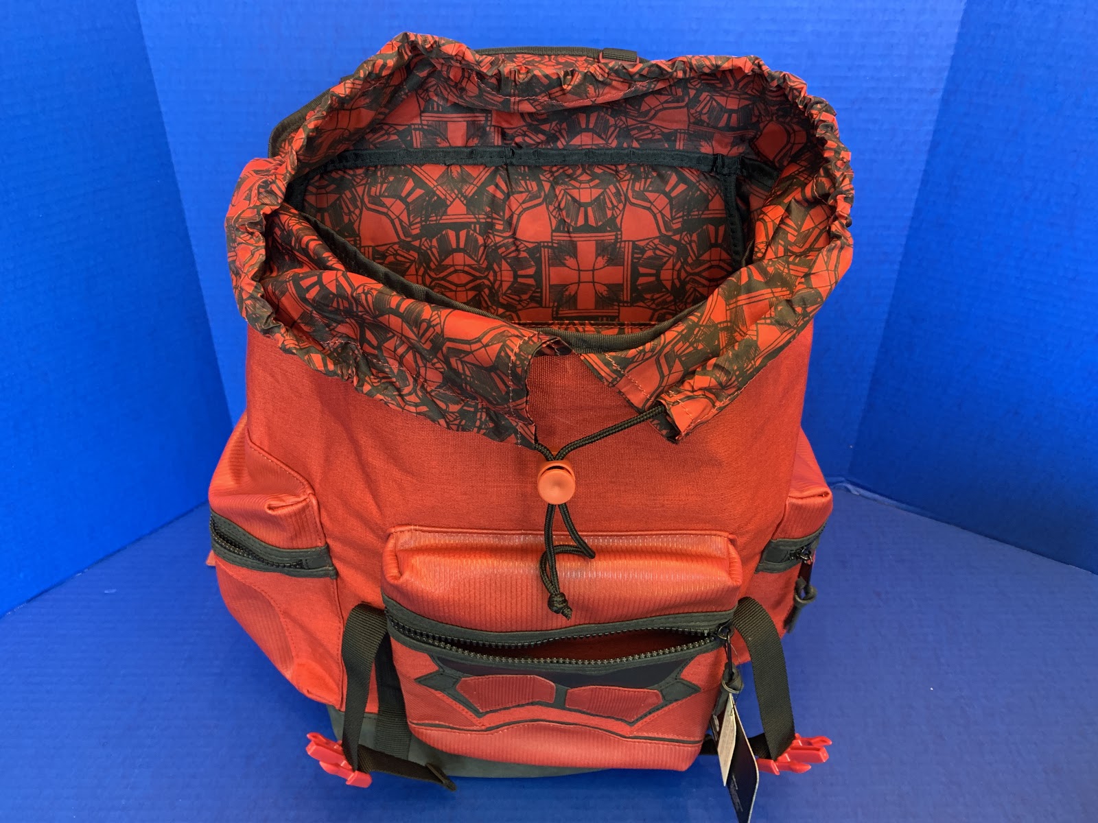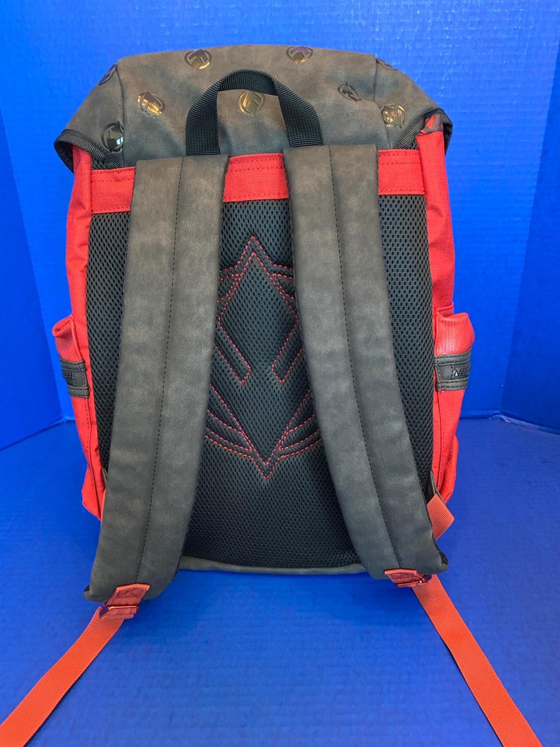 The bag features the vertical line accents embedded into faux leather, with the Sith Trooper’s face on the front pouch. The interior of each area features a pattern that features more of the character’s iconography. The top section features metallic clips that secure it over the drawstring compartment, which features a wide pouch perfect for storing a tablet and two smaller pouches, in addition to the large center area. There’s also a small zipper pouch on top that is the right size for a cell phone when going through airport security.
