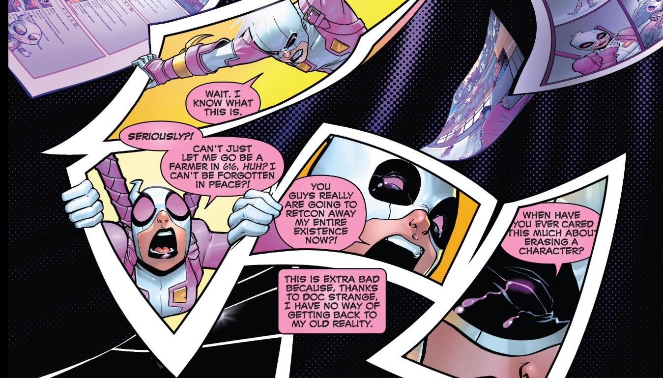 Gwenpool’s fourth wall-breaking puts Deadpool’s to shame. In fact, the entire existence of this new series is a fourth wall break. Gwenpool is actually just a comic fan who has somehow gotten herself into the comic universe. Doctor Strange tethered her there so now she can’t get back, which she is perfectly fine with. The only problem is, readers don’t find her interesting enough for her to keep getting her own stories. So, if writers don’t write stories for her anymore, she’ll disappear forever.