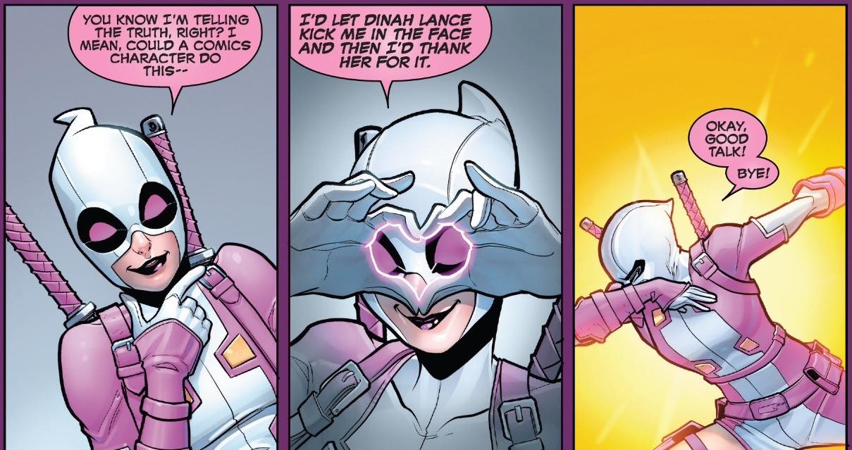 So Gwenpool’s plan is to get herself an interesting super power, since she doesn’t actually have any of her own. At least, she says she doesn’t, but personally I feel that her copy of Deadpool’s comic awareness combined with some hilarious quips are the best superpower of all. I mean, it’s not often you see a Marvel character reference a DC character.