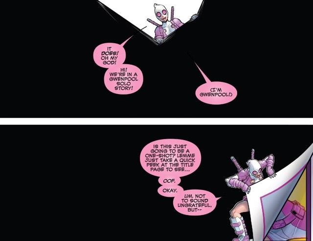 The much lesser known character has her own new mini series and she couldn’t be more excited about it. That’s right, I just told you how Gewnpool feels. That’s because, despite “Gwenpool Strikes Back #1” being the first I’ve ever read of the character, I feel like I know her now. Mostly because she spends the first few pages explaining her backstory herself.