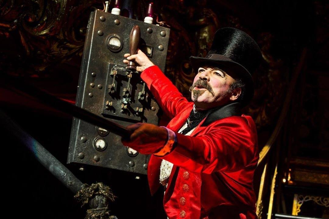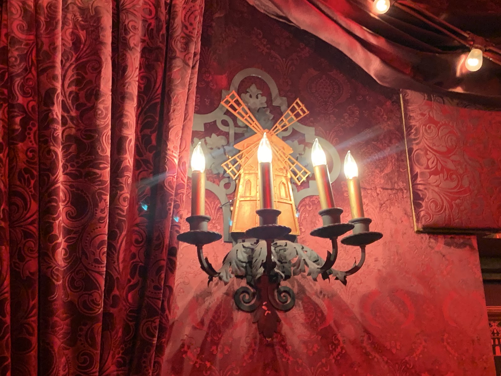 The show truly starts the moment you enter the Al Hirschfeld Theater, where the walls have been covered in red velvet and light fixtures swapped out with ones that tie you into the story, such as the windmill sconces. The proscenium expands to the sides of the theater, with a rotating light up windmill on stage right and a giant elephant statue on stage left. Audience members can upgrade their seats to sit between the stage and catwalk. Actors take the stage prior to the official start of the show, eyeing the audience for potential private patrons, smoking cigarettes, and even performing short acts of burlesque. Without any kind of overture, the show starts suddenly as Harold Zidler arrives, flips a switch, and the heart-shaped curtains raise to reveal a quartet of scantily clad ladies who welcome you to the Moulin Rouge with “Lady Marmalade.”